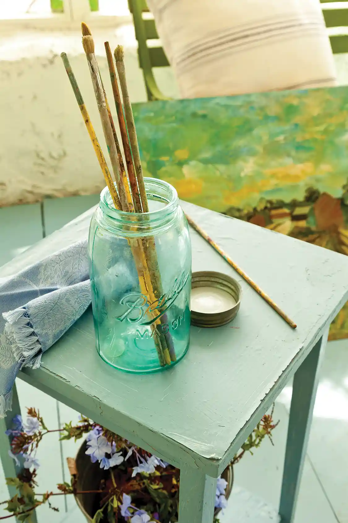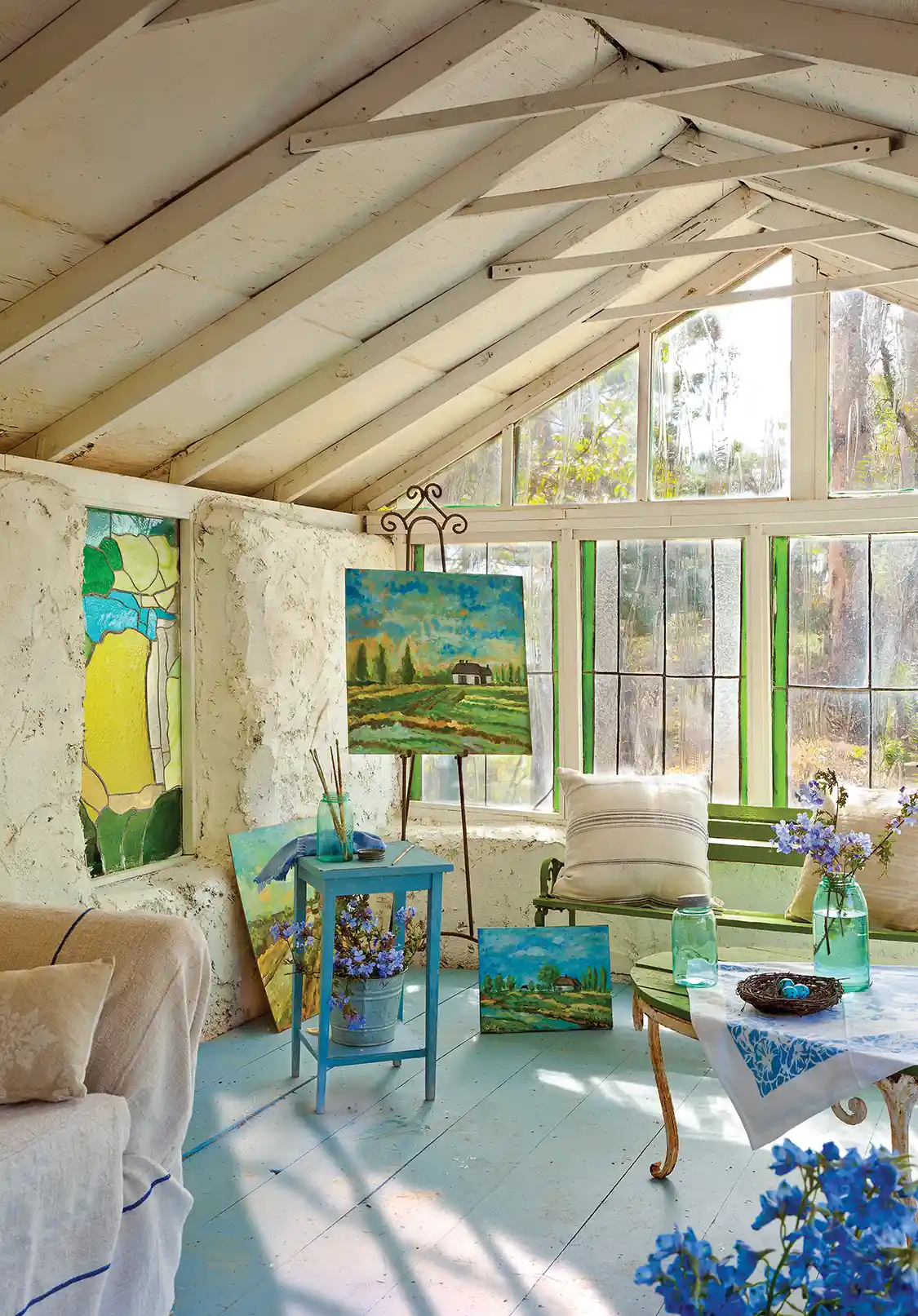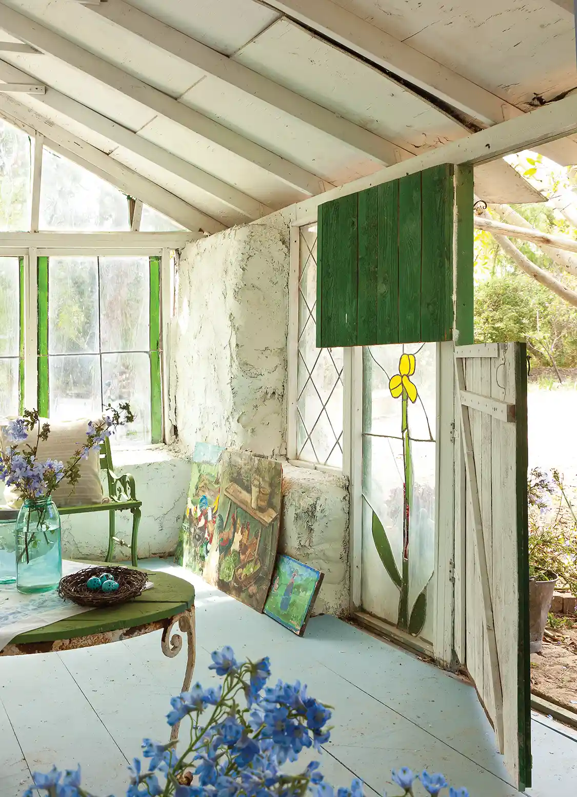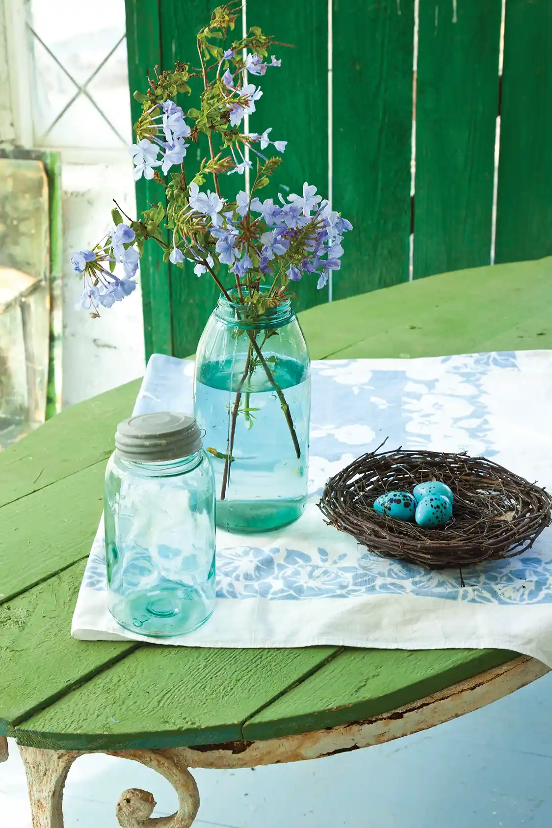 Play Around. This is your space, so feel free to experiment. Bonnie’s cottage is decorated with spring touches—the nest with robin’s eggs and blue Mason jars with wisteria, for example. You could swap things out seasonally or bring touches of whatever seasonal beauty abounds. It also provides a great place to try out customizing flea market furniture by painting it to match your space.