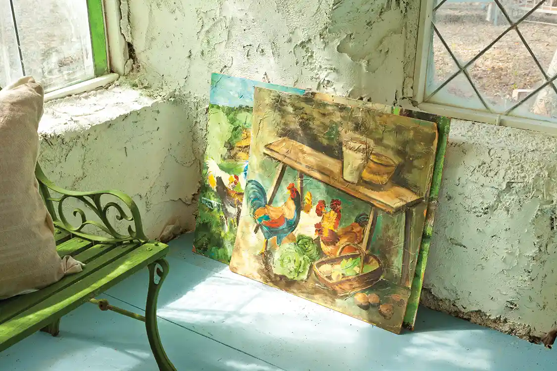 What’s more, Bonnie also paints. All the paintings in the cottage are her handiwork. While a spot in the main Tudor style house overlooking a mature elm tree serves as her artist’s studio, this space is imbued with her artistic work and lends the space aunique and handmade beauty.