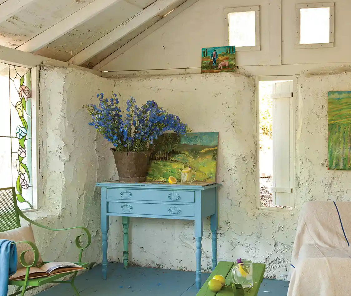 Imagine living in a charming, small town in Southern California with a she-shed-of-sorts you made and decorated with your own hands. That’s the case for artist and homeowner Bonnie Holt.