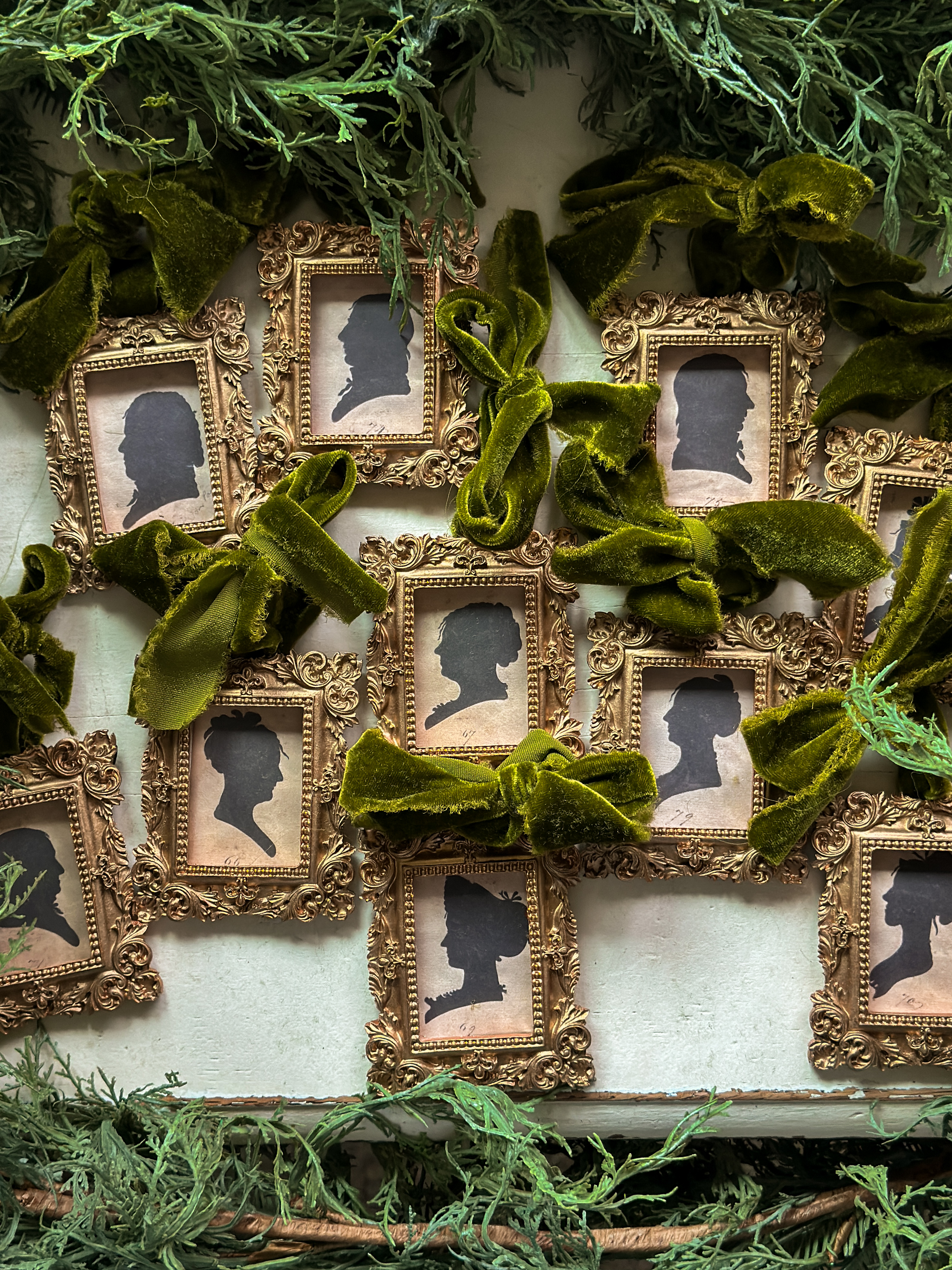 I first purchased all of my supplies off Amazon: 10 ornament frames, a book on silhouettes (I’m going to use the cover), some pretty ribbon, and some Rub ‘n Buff (I used the shade “European Gold”).