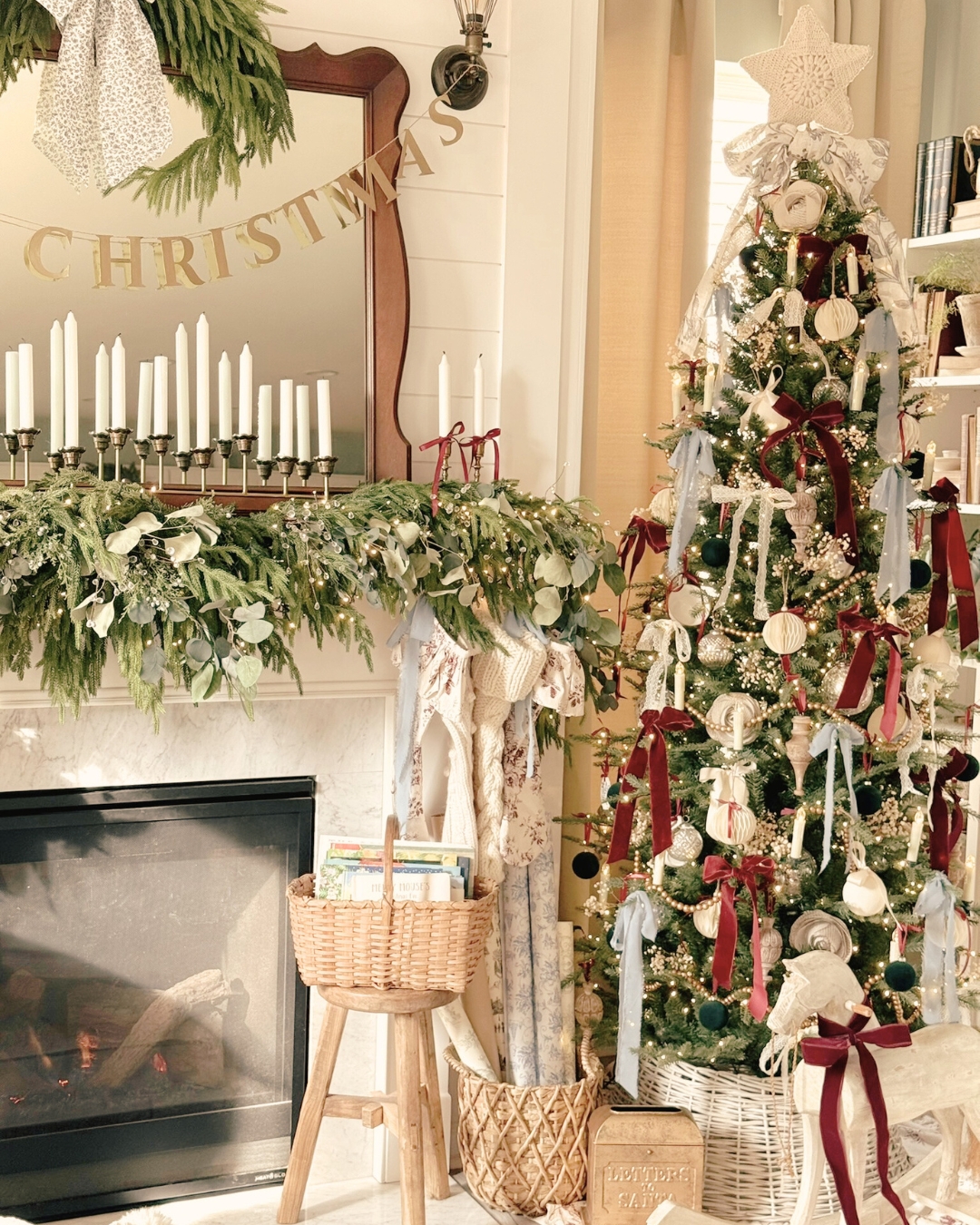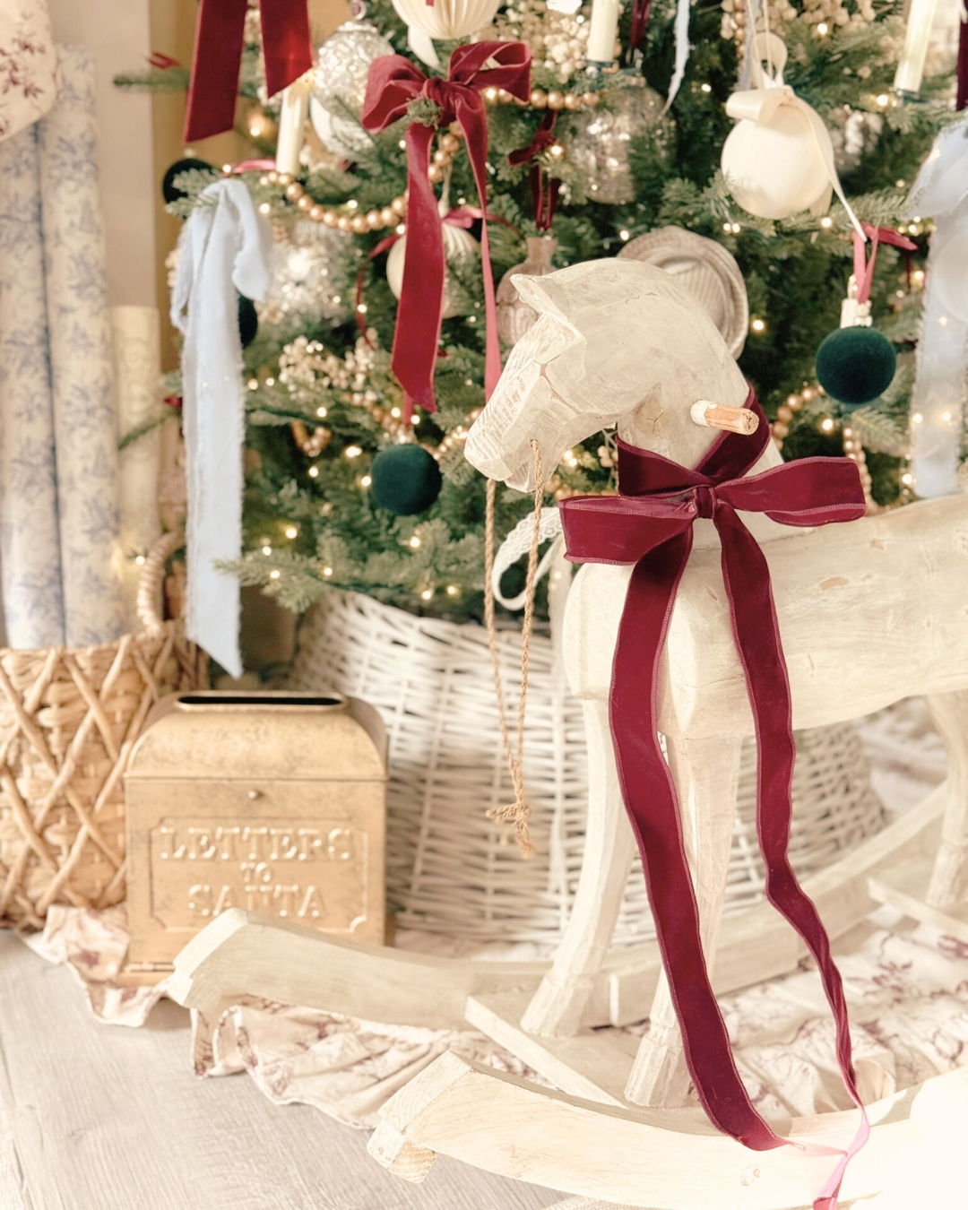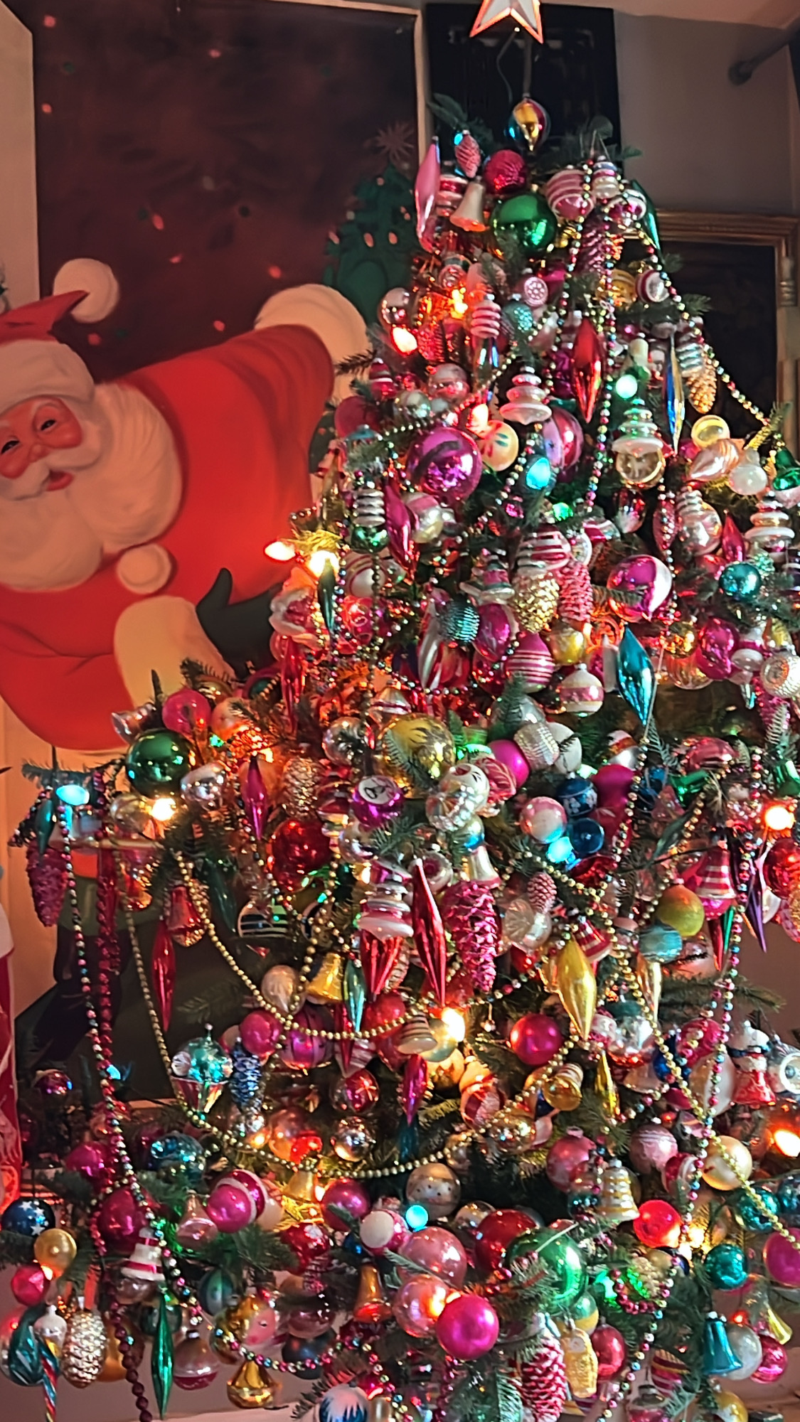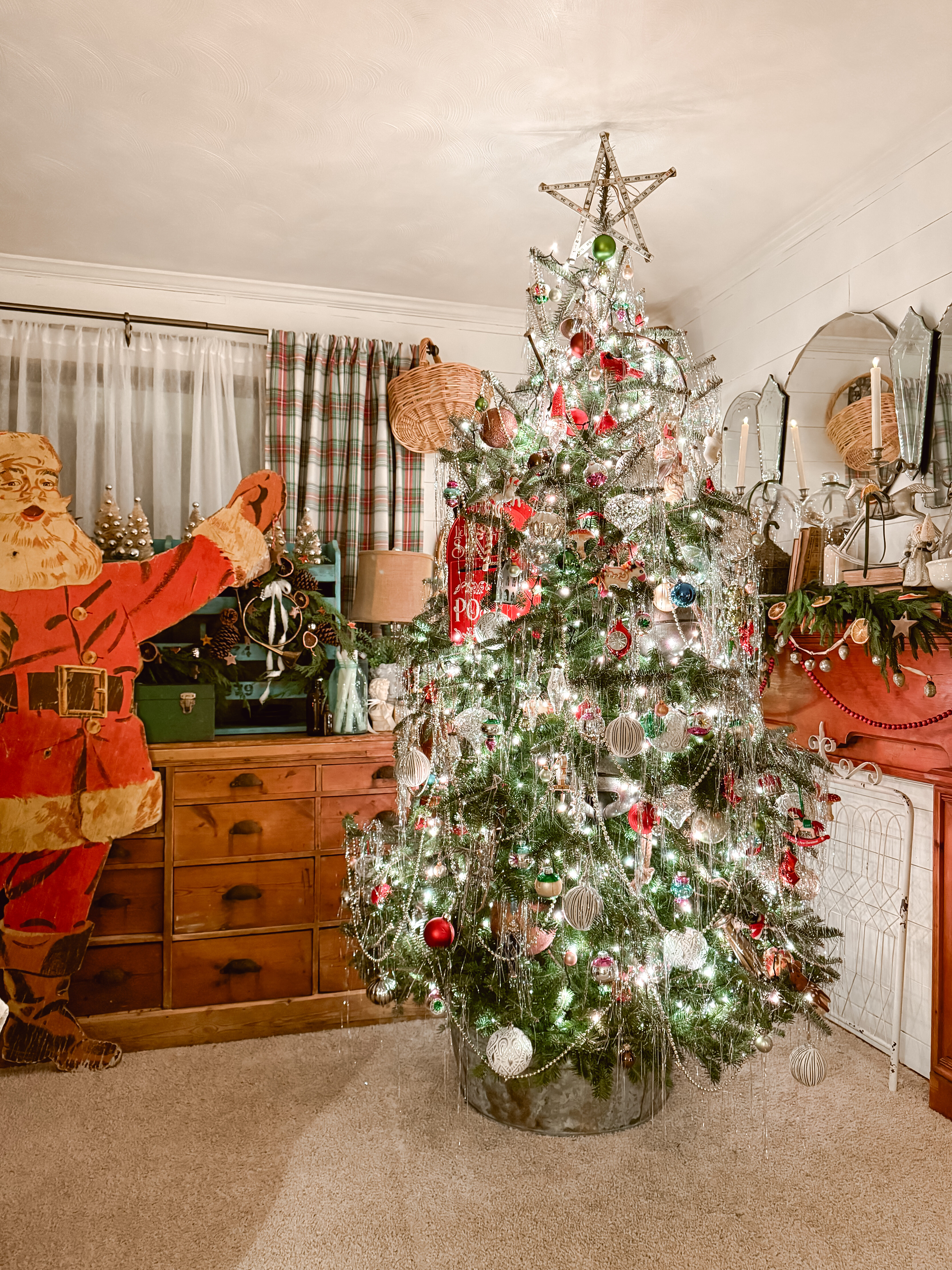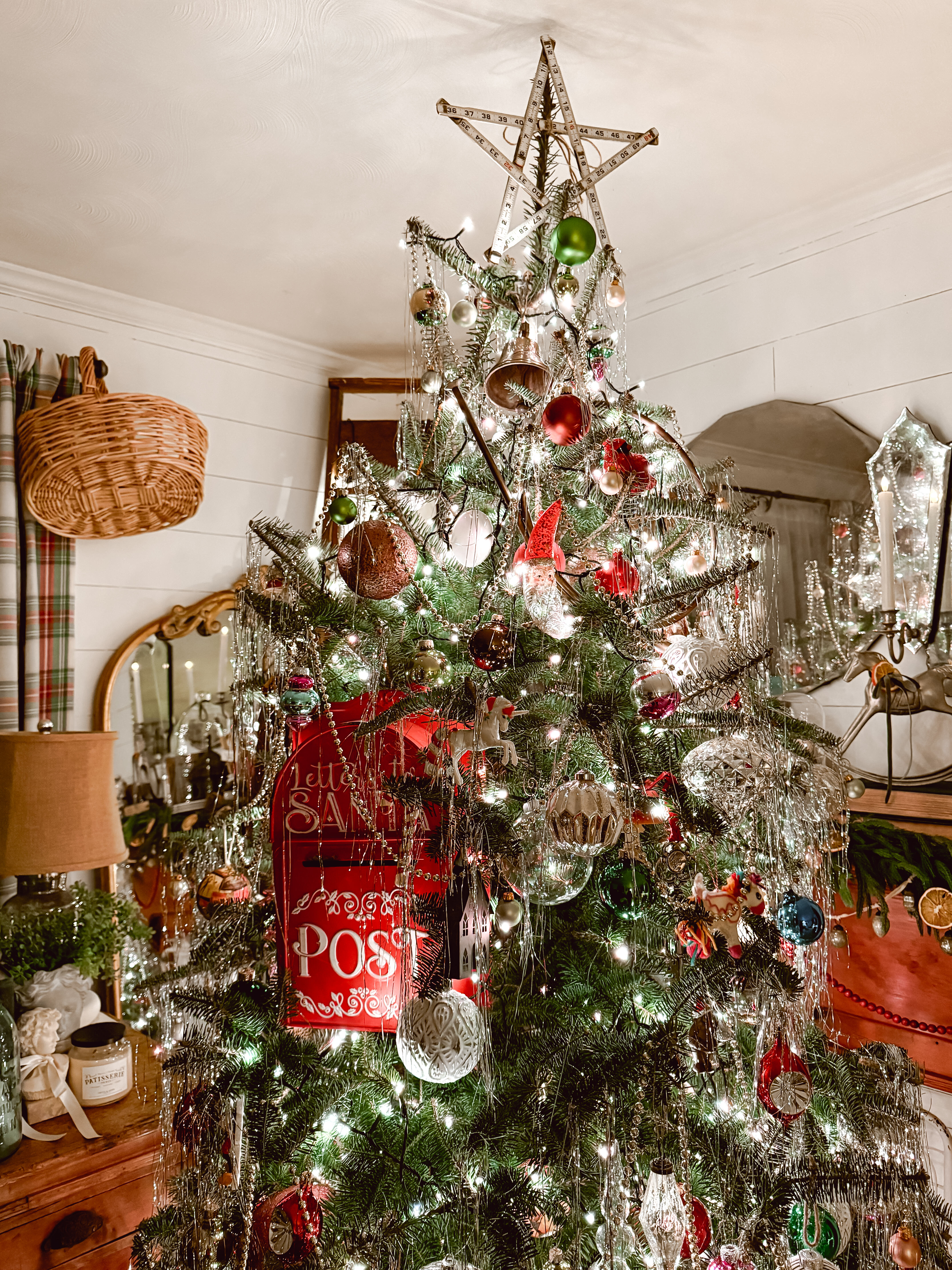 A collection of vintage and new ornaments, cherished family ornaments, oversized jingle bells, a Santa’s Post mailbox, a vintage ruler tree topper, beaded garland, and tons of tinsel create our 2025 tree.