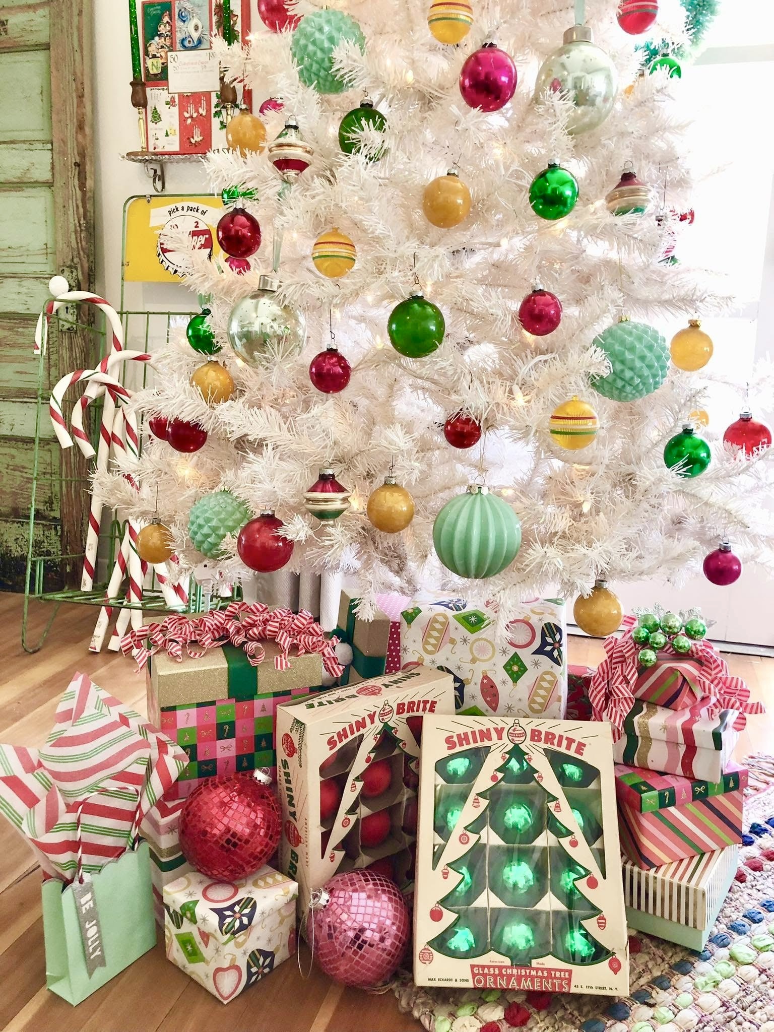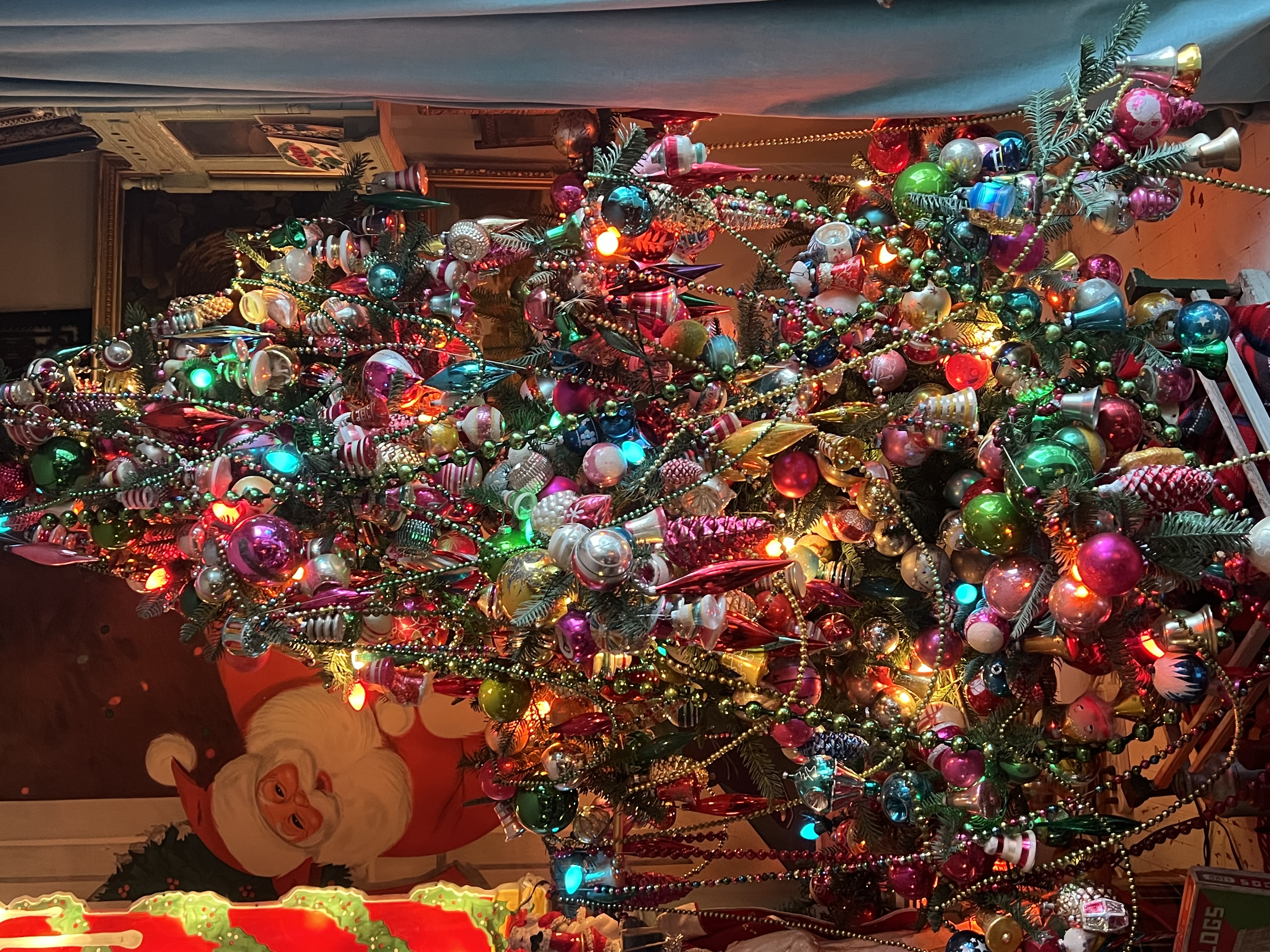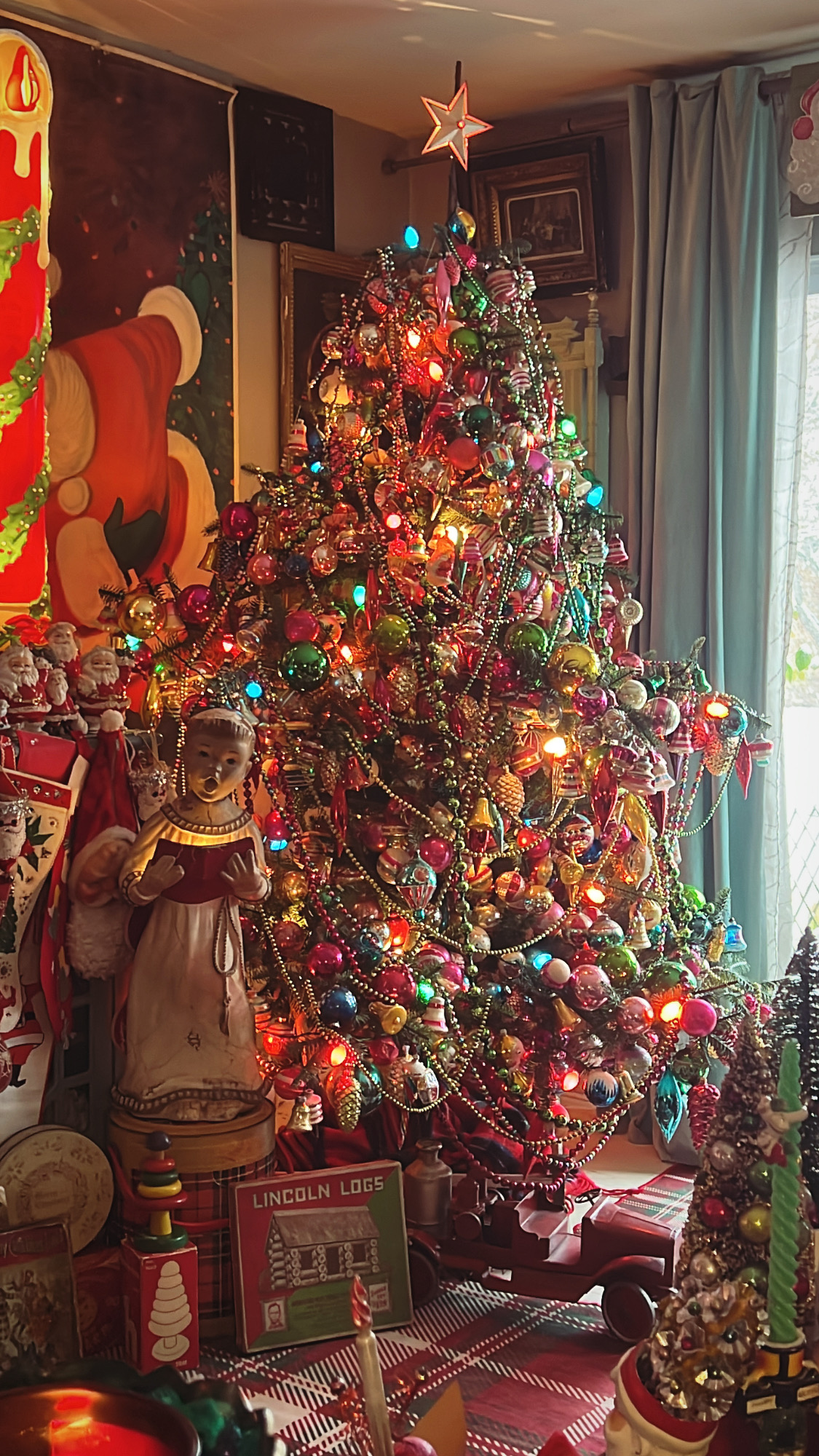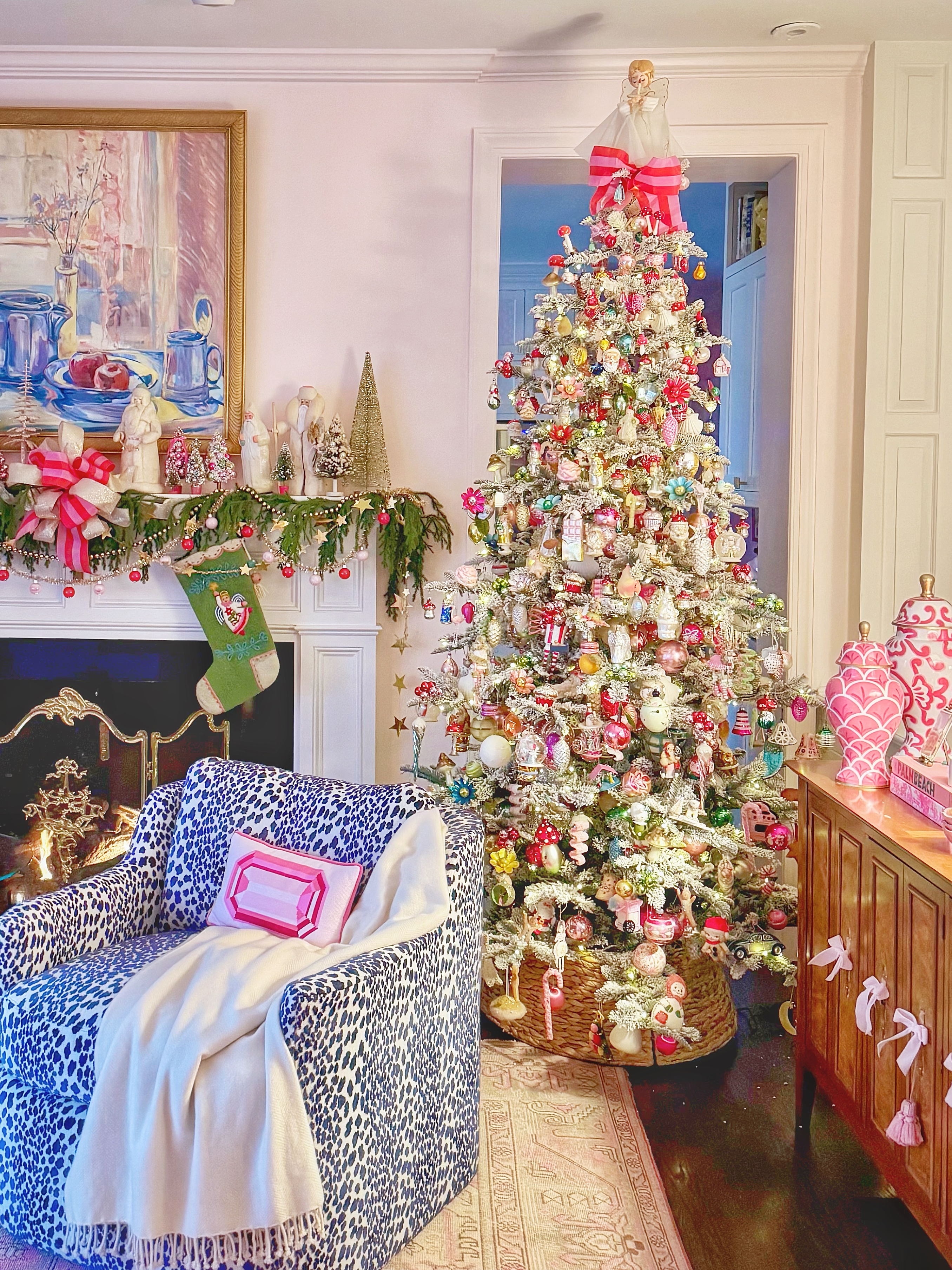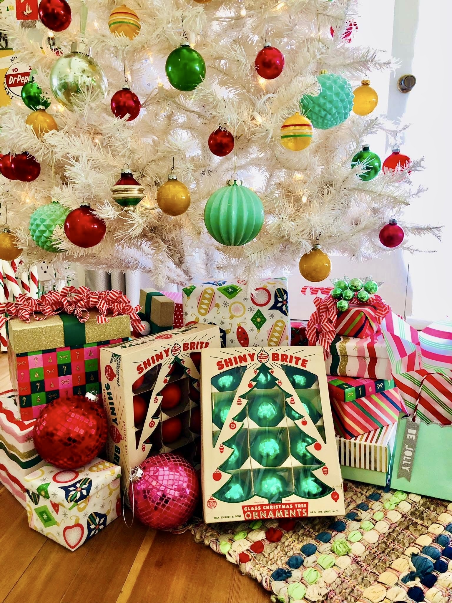 A collection of vintage and new ornaments, cherished family ornaments, oversized jingle bells, a Santa’s Post mailbox, a vintage ruler tree topper, beaded garland, and tons of tinsel create our 2025 tree.