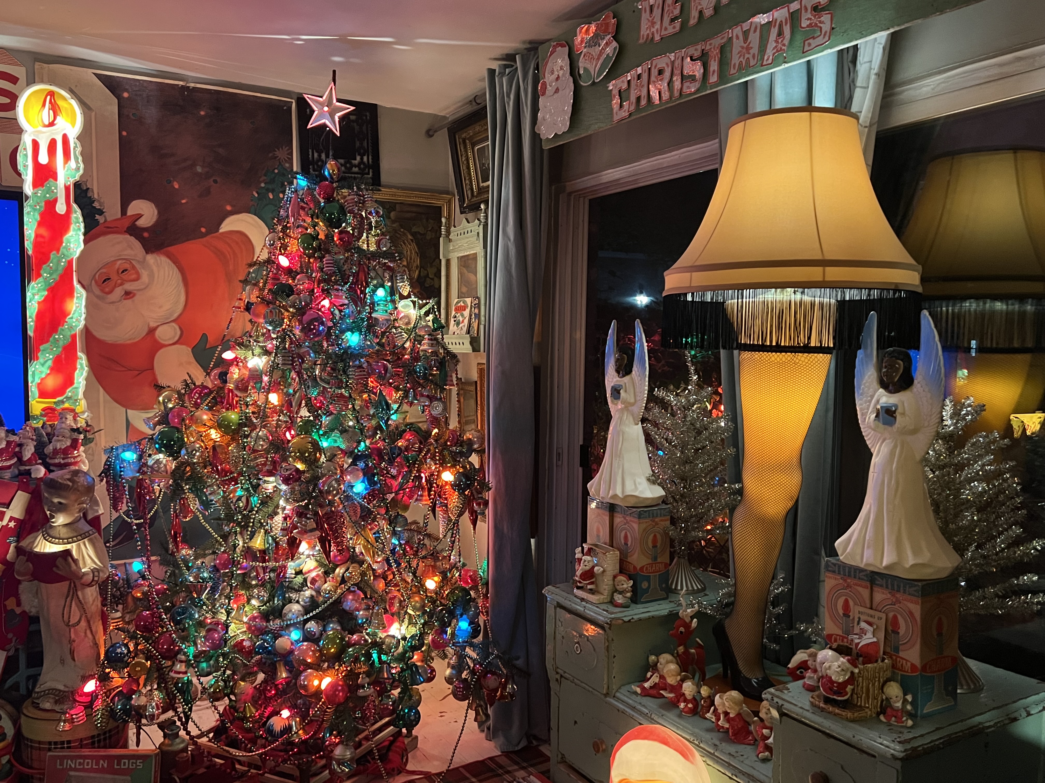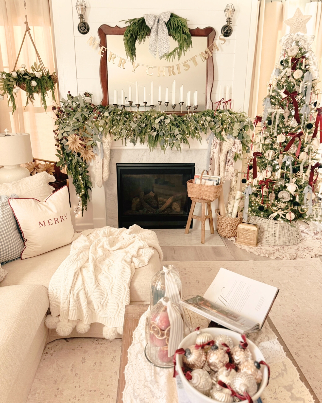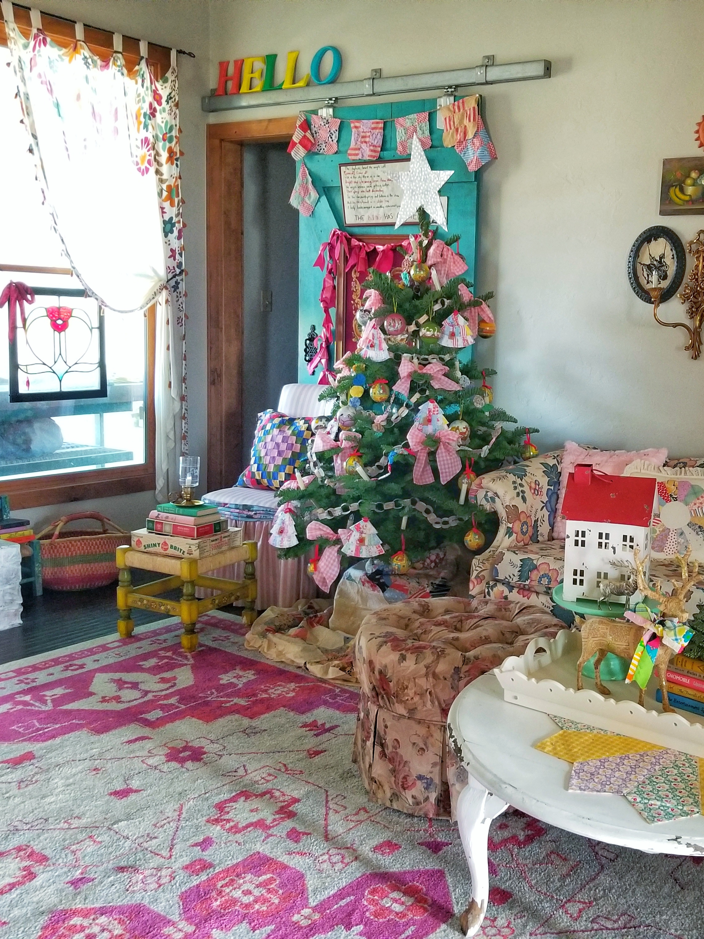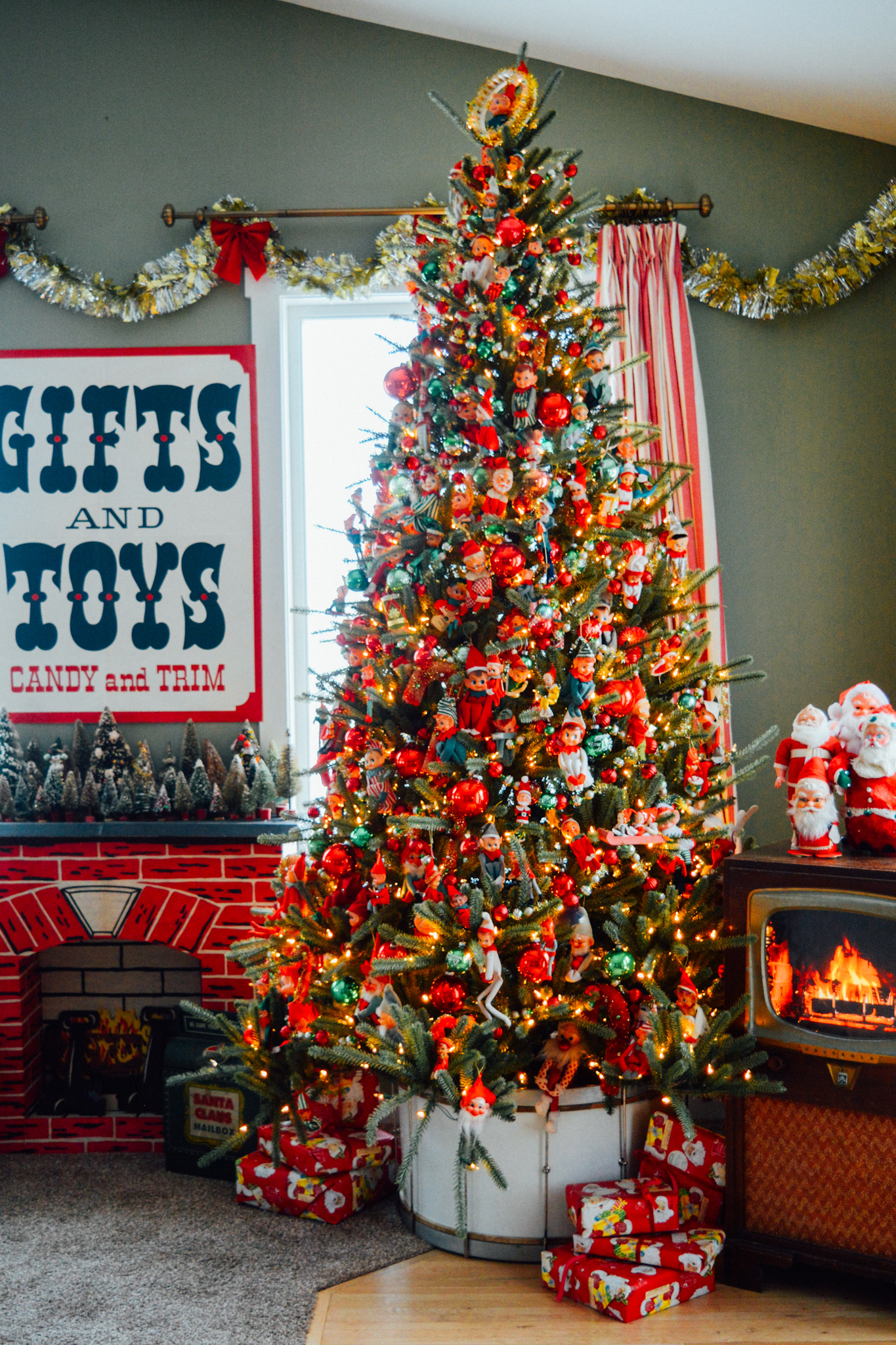 A collection of vintage and new ornaments, cherished family ornaments, oversized jingle bells, a Santa’s Post mailbox, a vintage ruler tree topper, beaded garland, and tons of tinsel create our 2025 tree.