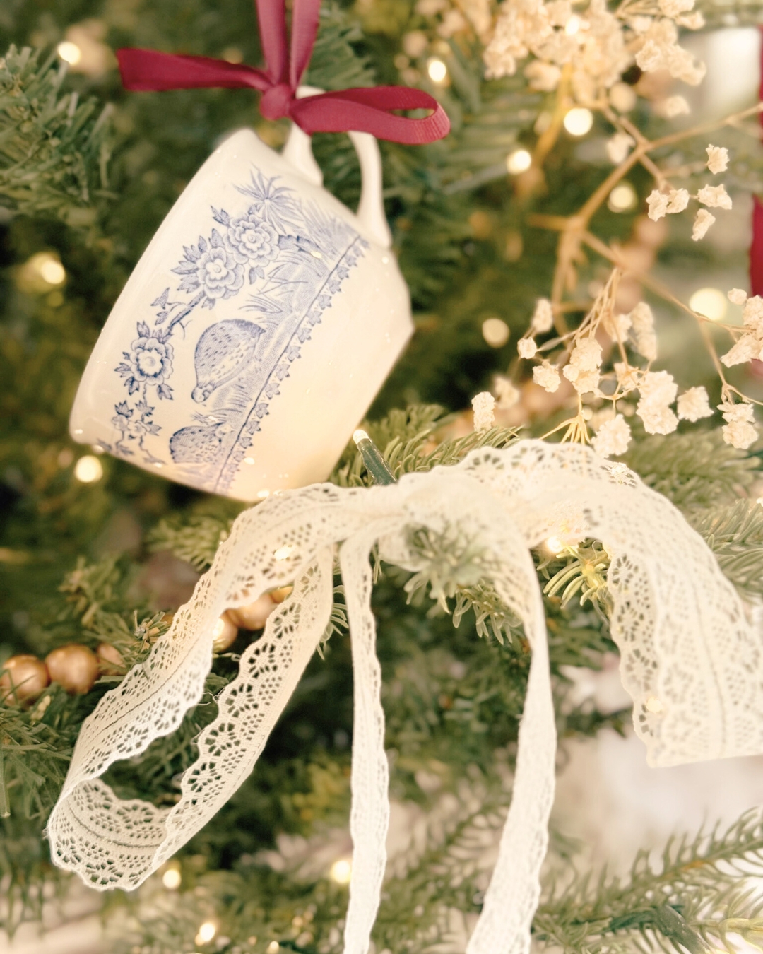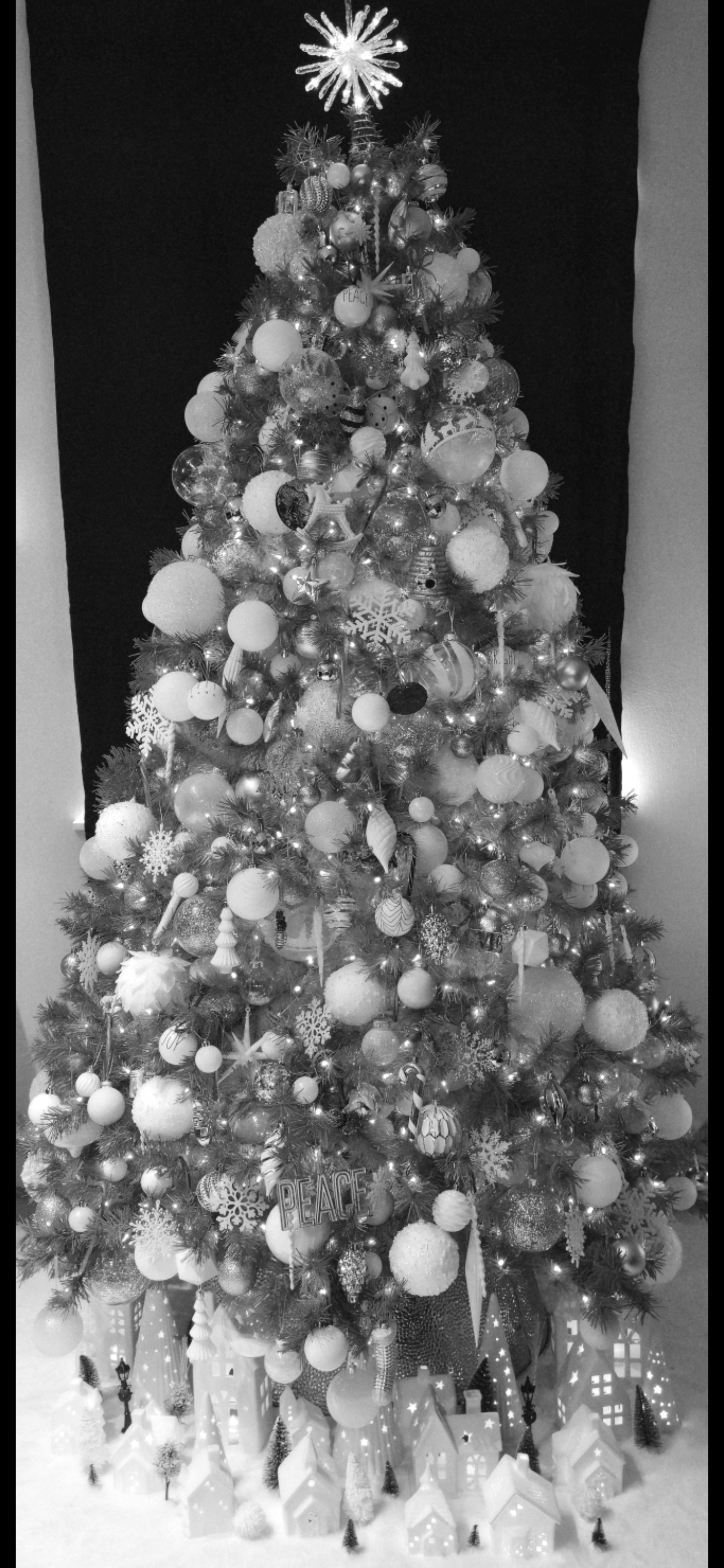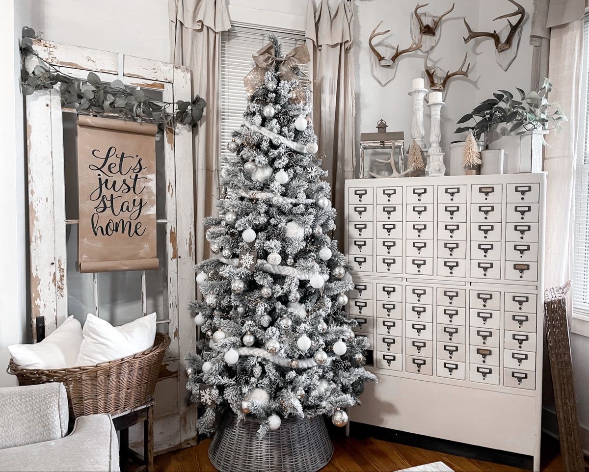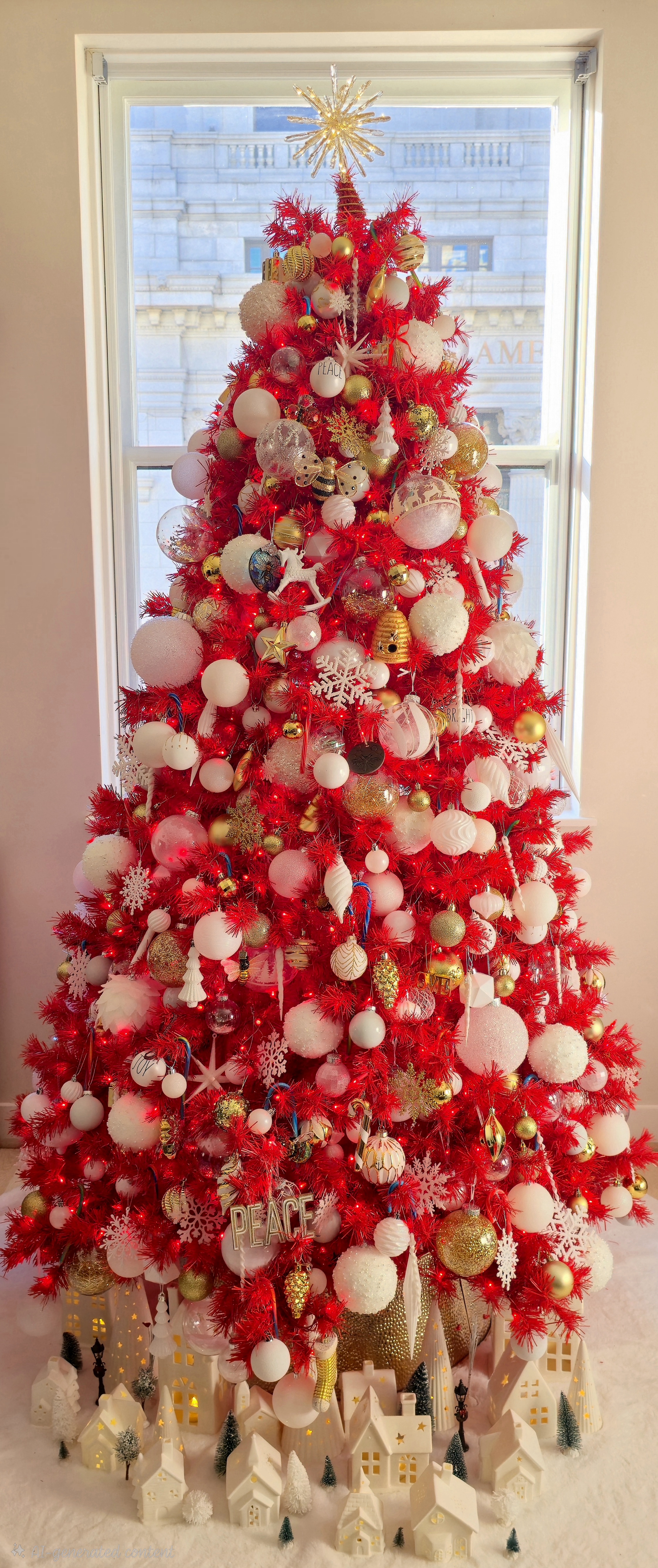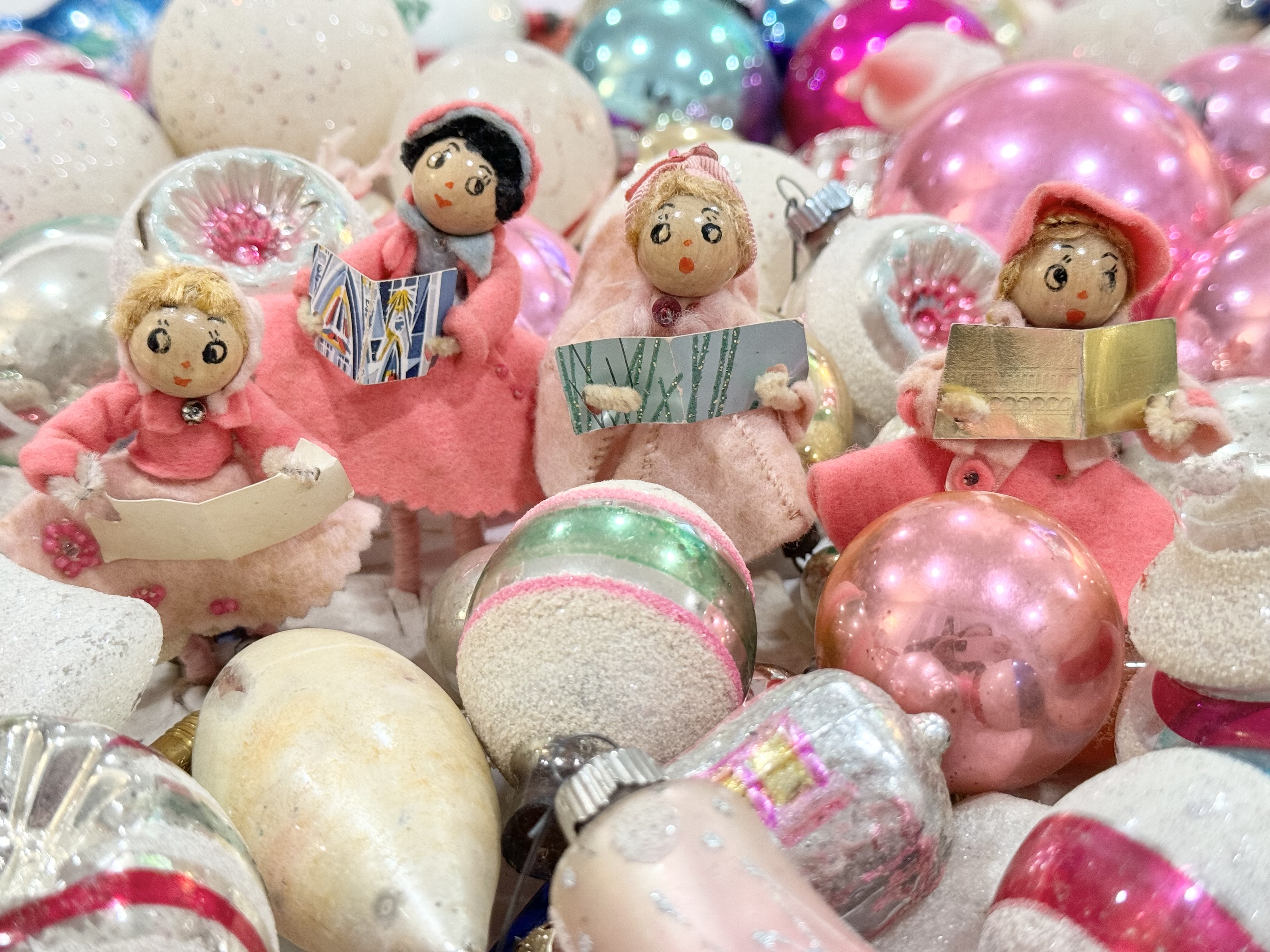 A collection of vintage and new ornaments, cherished family ornaments, oversized jingle bells, a Santa’s Post mailbox, a vintage ruler tree topper, beaded garland, and tons of tinsel create our 2025 tree.