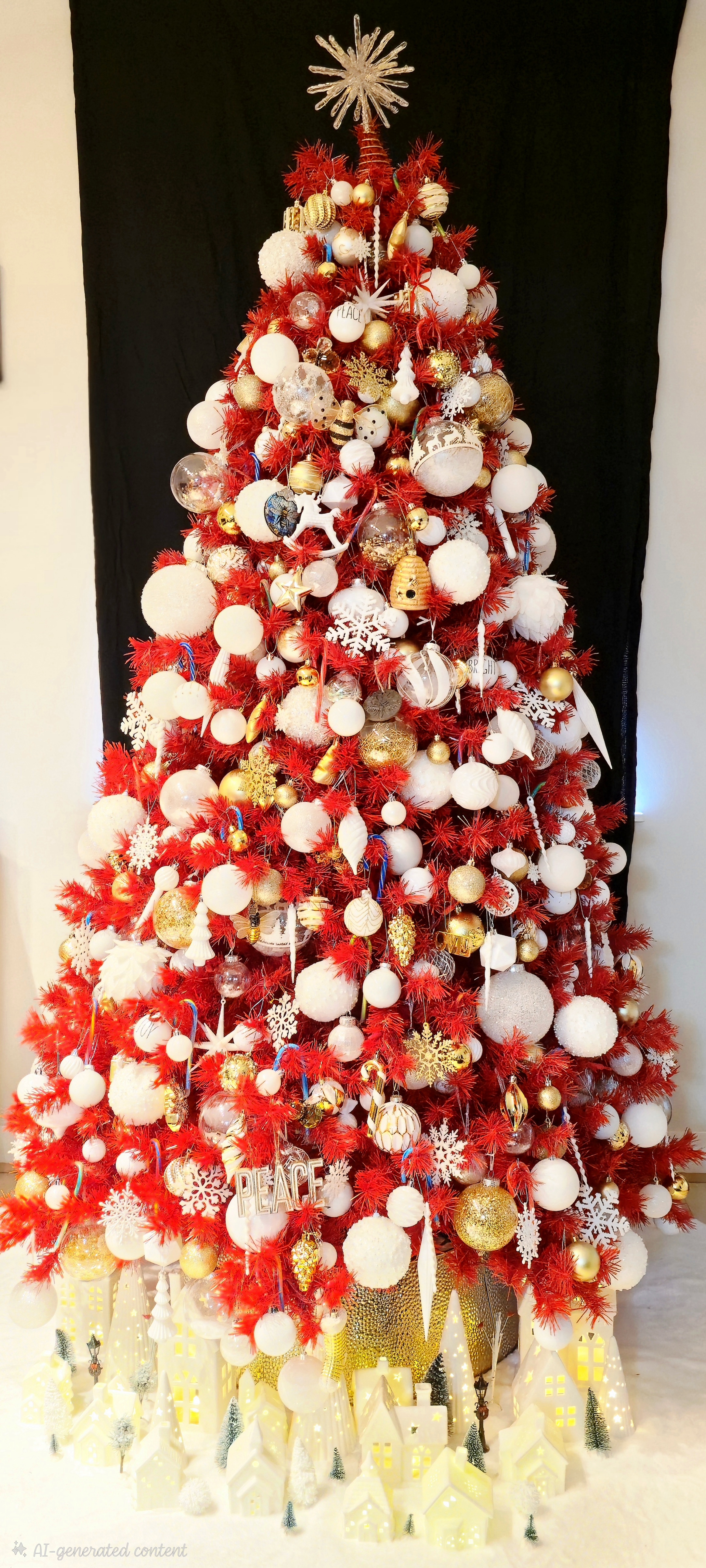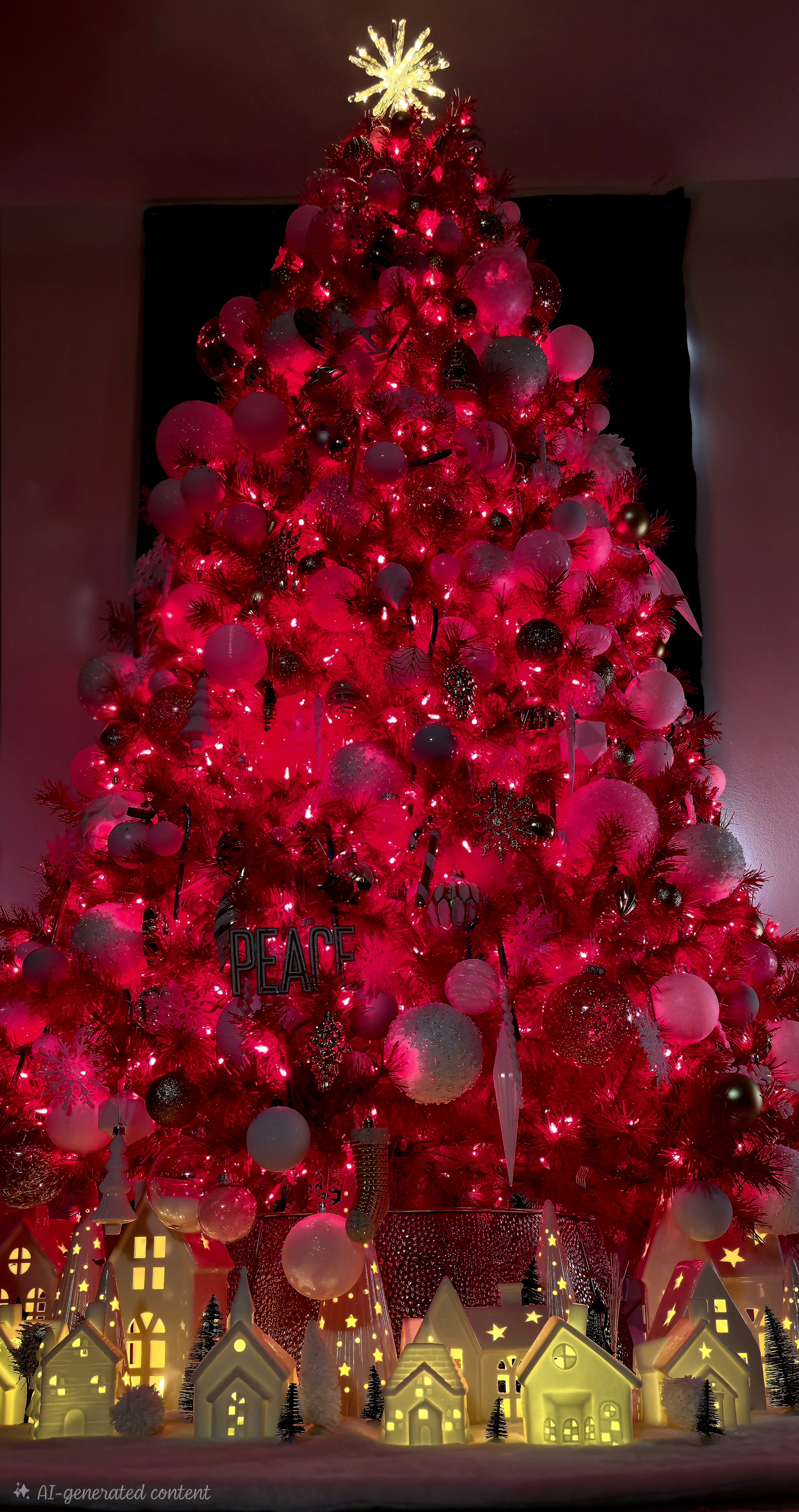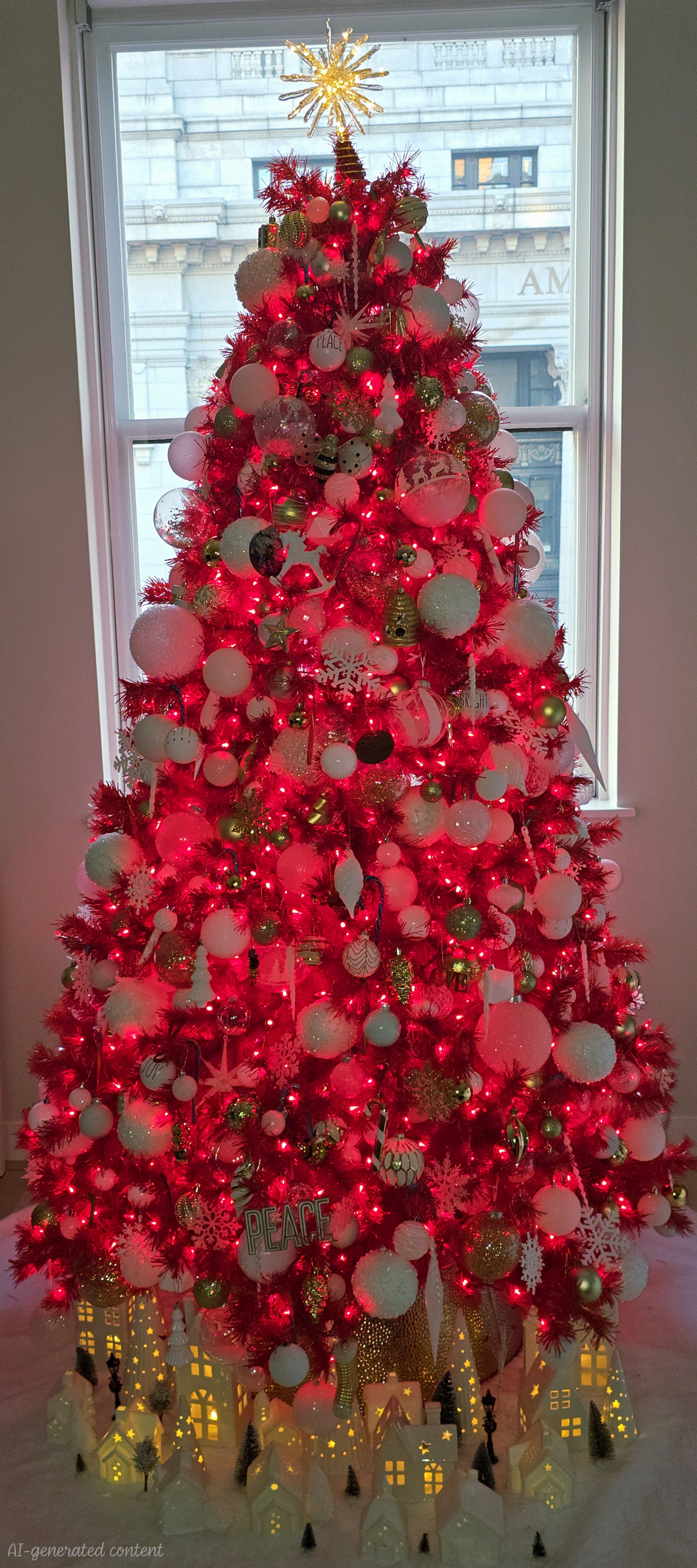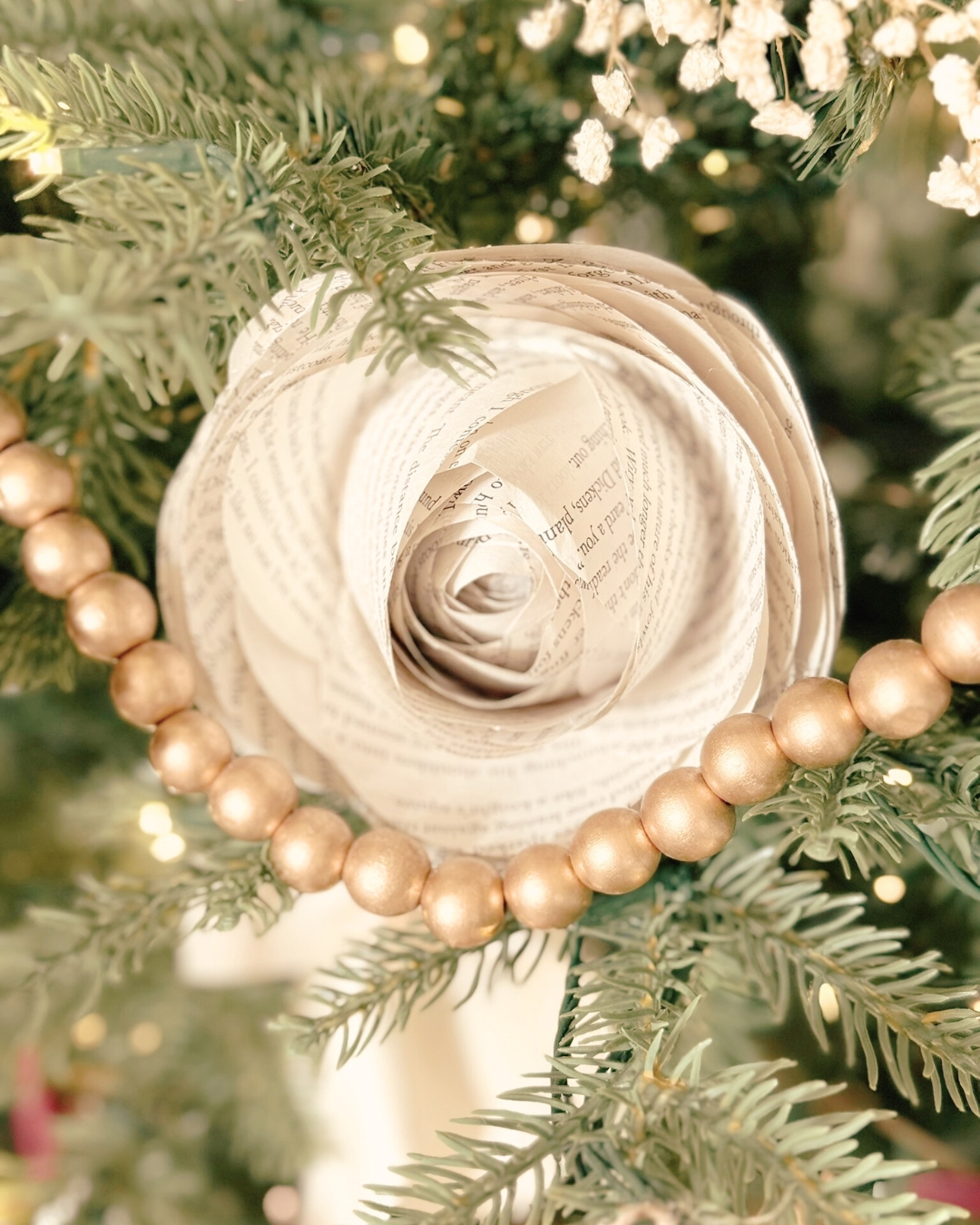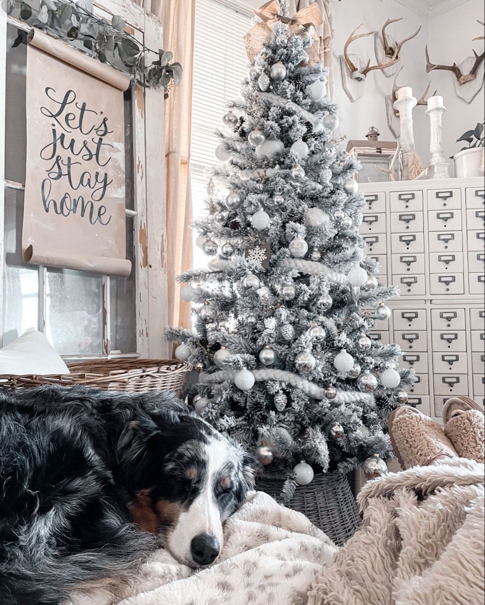 A collection of vintage and new ornaments, cherished family ornaments, oversized jingle bells, a Santa’s Post mailbox, a vintage ruler tree topper, beaded garland, and tons of tinsel create our 2025 tree.