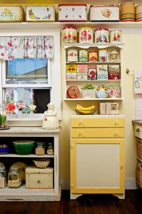 Collectibles like bread boxes, kitchen tins and recipe keepers do double duty. Use them to store pantry staples, odds and ends, and more. Old furniture pieces are the perfect solution in kitchens that lack cabinet space. Adding a high shelf around the room’s perimeter lets you show off your collections in style. Grouping like items, such as the bread boxes along the top shelf and the kitchen tins above the cabinet, give the room a balanced look. By Rebecca Ittner Photo by Jaimee Itagaki