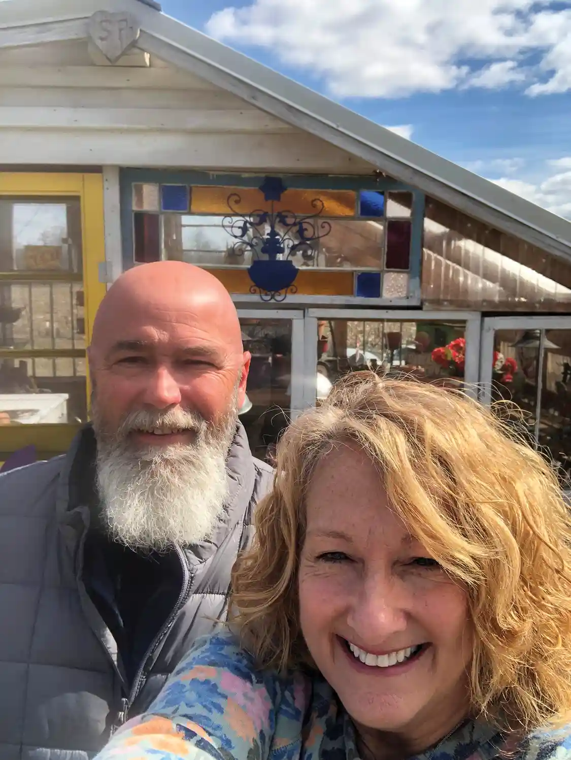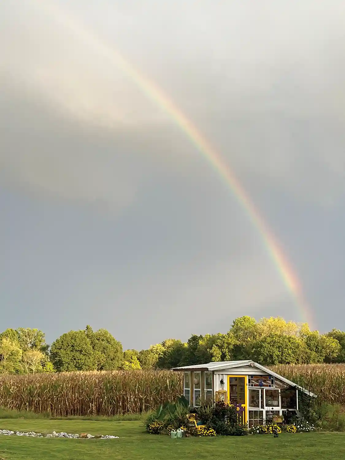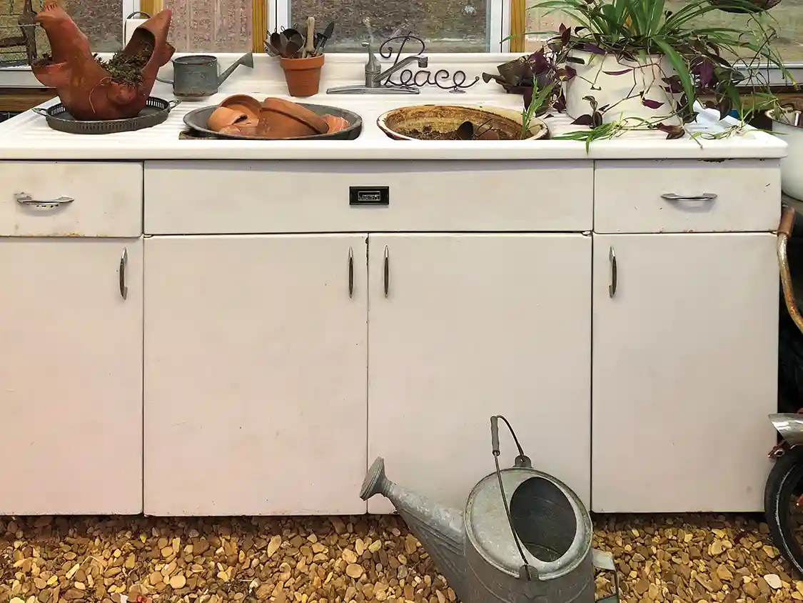 In southern Illinois, Navy veteran Shane Hileman and his wife Paula Hileman finished building their greenhouse in eight days! What’s even more amazing is that they used re-purposed materials; such as, stained-glass windows from their family’s home and doors from their parents’ old renovation projects. Paula further shared that the greenhouse benefits from lots of unique second-hand items that add charm and character. For example, Paula was given an old Montgomery Ward sink from her childhood church that she used as a potting bench. She added, “We were seeing an old bathtub in the front yard of a house we drove by all the time. One day, Shane said: ‘I’m stopping and asking is we can buy it for the greenhouse.’ He did, and now it sits in the front windows. Perfect for early lettuce patch and later filled with petunias planted from seed.” Shane also built shelving for seed trays and clay pots for all of Paula’s flea market gardening supplies. Paula also repurposes items like enamelware buckets, pans, teapots, and cups for pots; she says, “If it holds dirt I can plant in it,” and shares that the greenhouse is the perfect place to work on these projects.