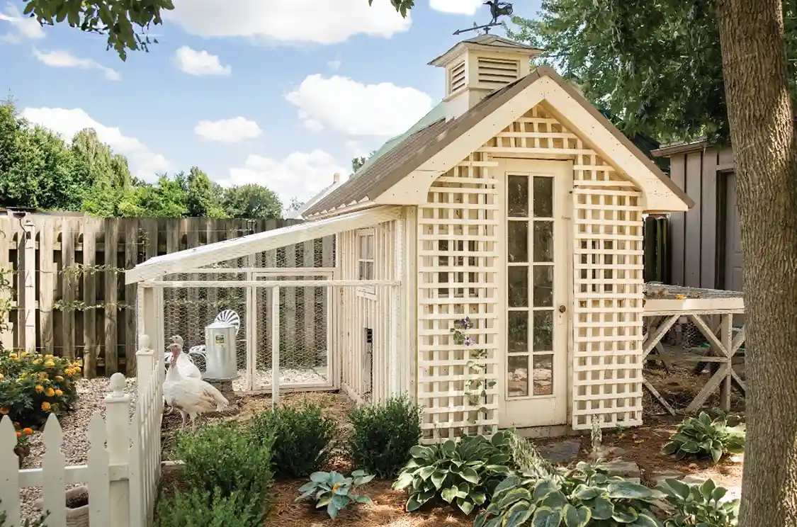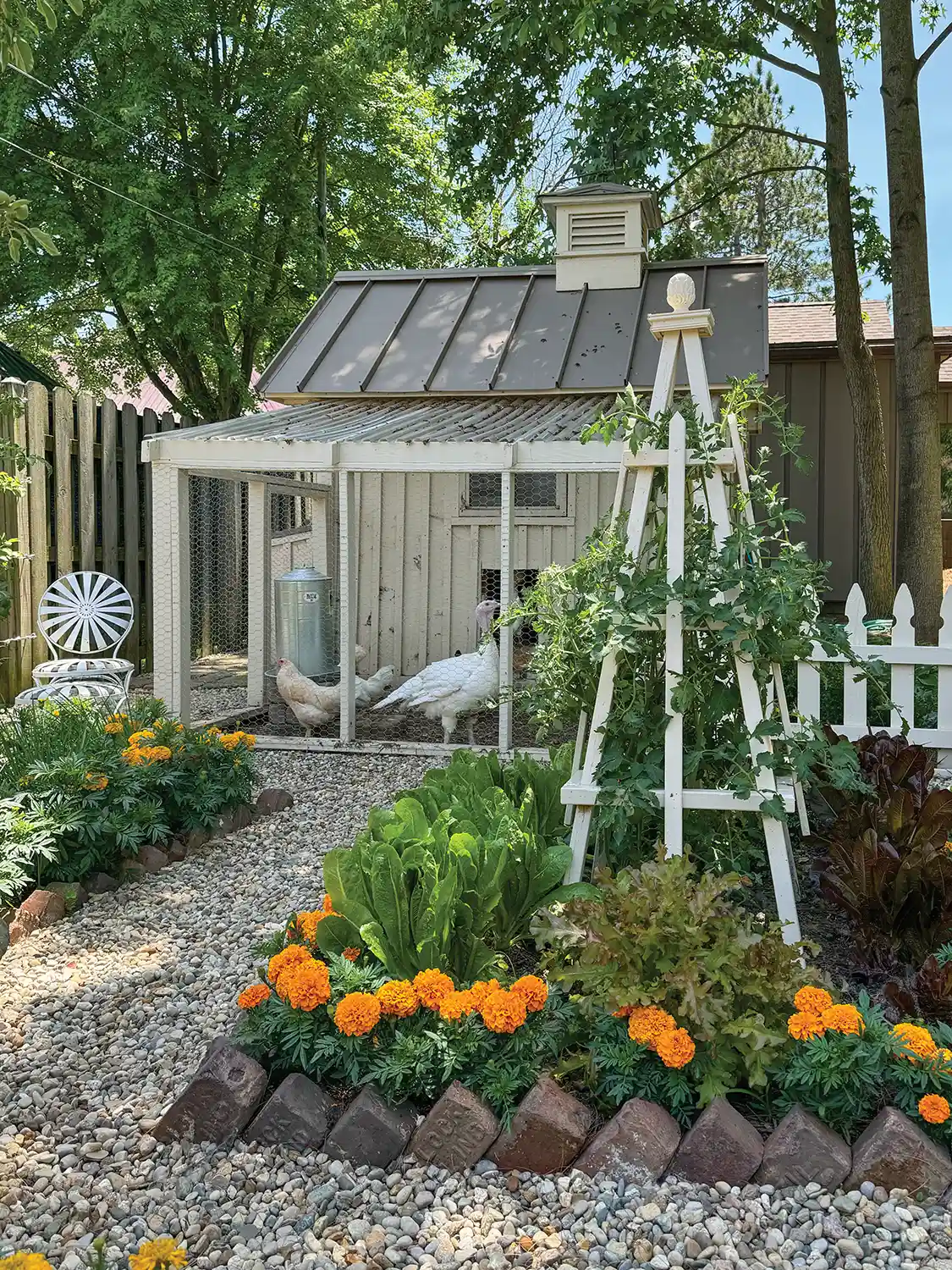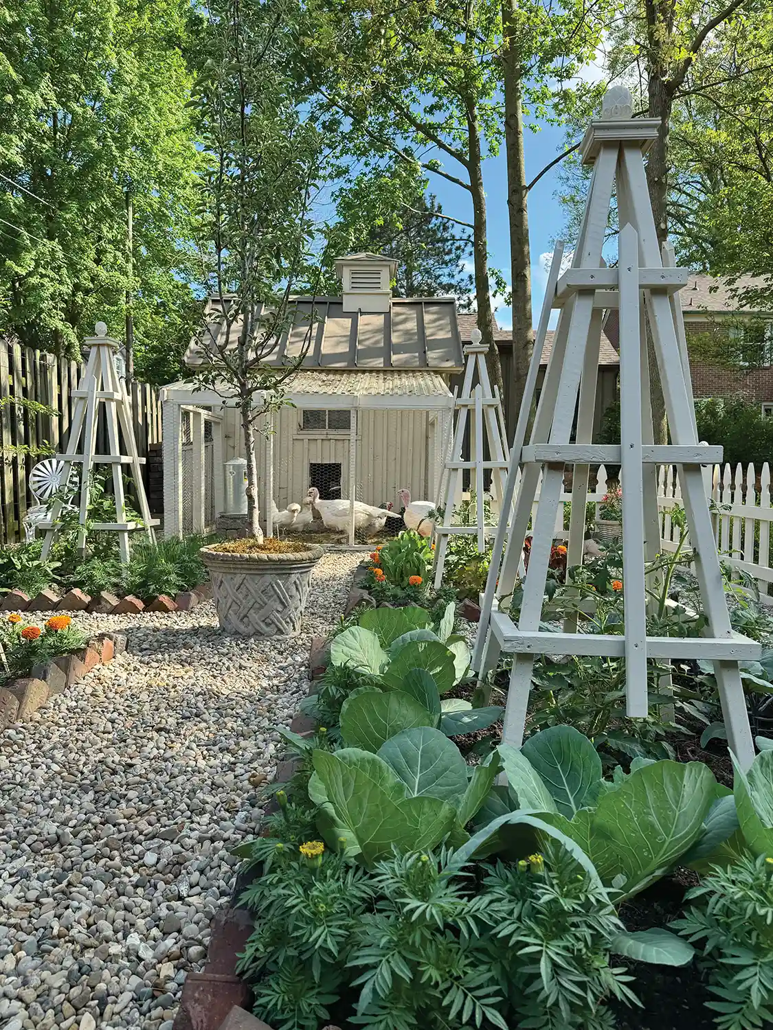This charming 1940s brick colonial revival in Brazil, IN provided the perfect space for owners Kemp Harper and Kevin Boling to build their dream garden. The garden pays homage to both their town’s history, as well as their families. Kemp shared that their garden is “thoughtfully divided into four quadrants arranged along an axis. The beds are bordered with antique ‘Brazil block,’ the very bricks that once paved our town’s roads. In the center of each quadrant stands a wooden obelisk I crafted myself that serve as tomato supports.” Kemp and Kevin have planted a vegetable garden, a peony garden, espaliered apple and cherry trees, and even built a chicken coop—which houses 20 hens and four turkeys! The chicken coop is built from Kemp’s grandmother’s hayloft floorboards from her 1800s barn that was unfortunately demolished. Kemp adds, “My late grandmother was Polish, and we keep Polish hens in our coop, keeping a piece of her spirit alive with us.” Kemp mentions that the chicken run overlooks the garden, and he enjoys watching them while he works.