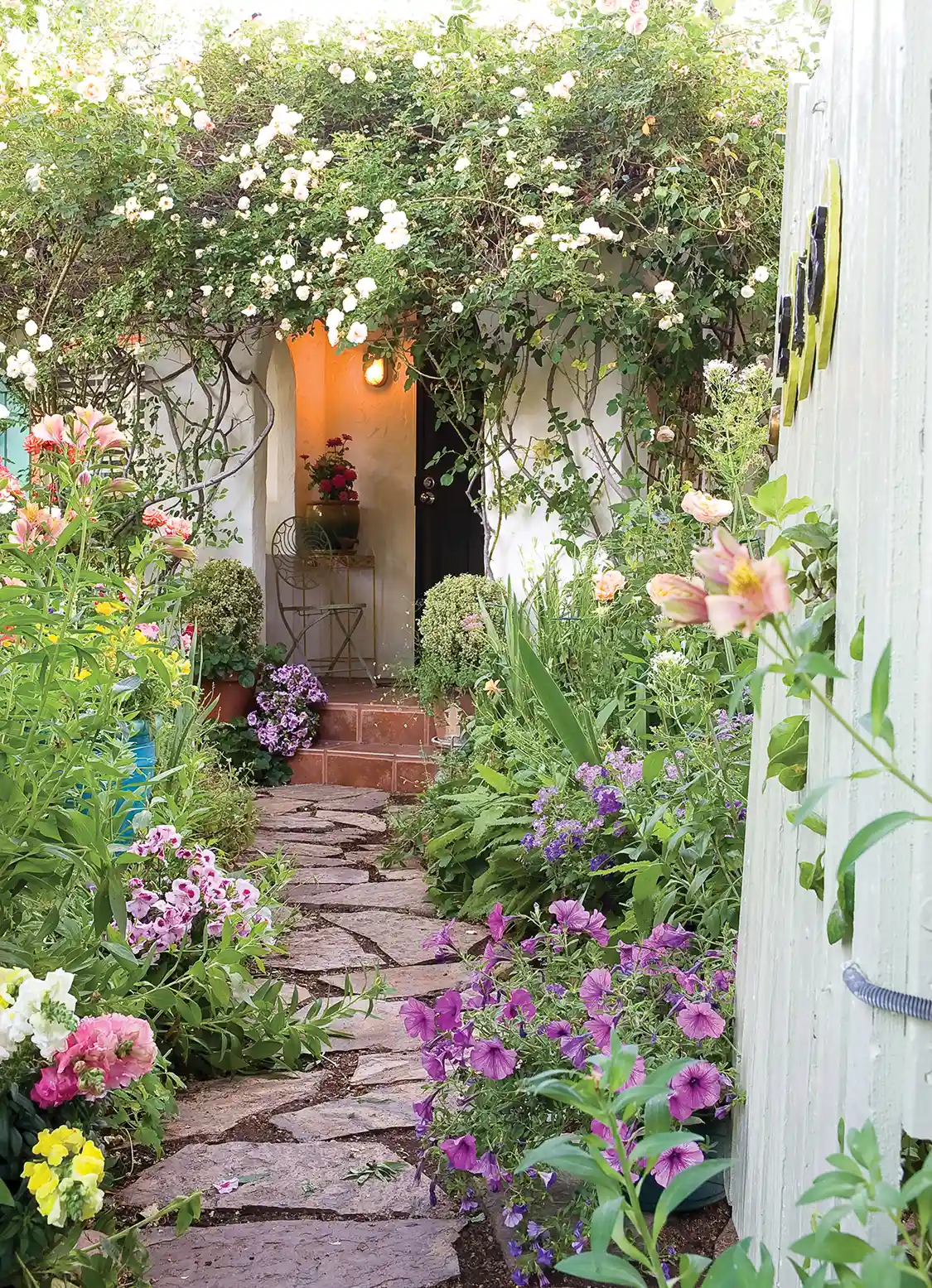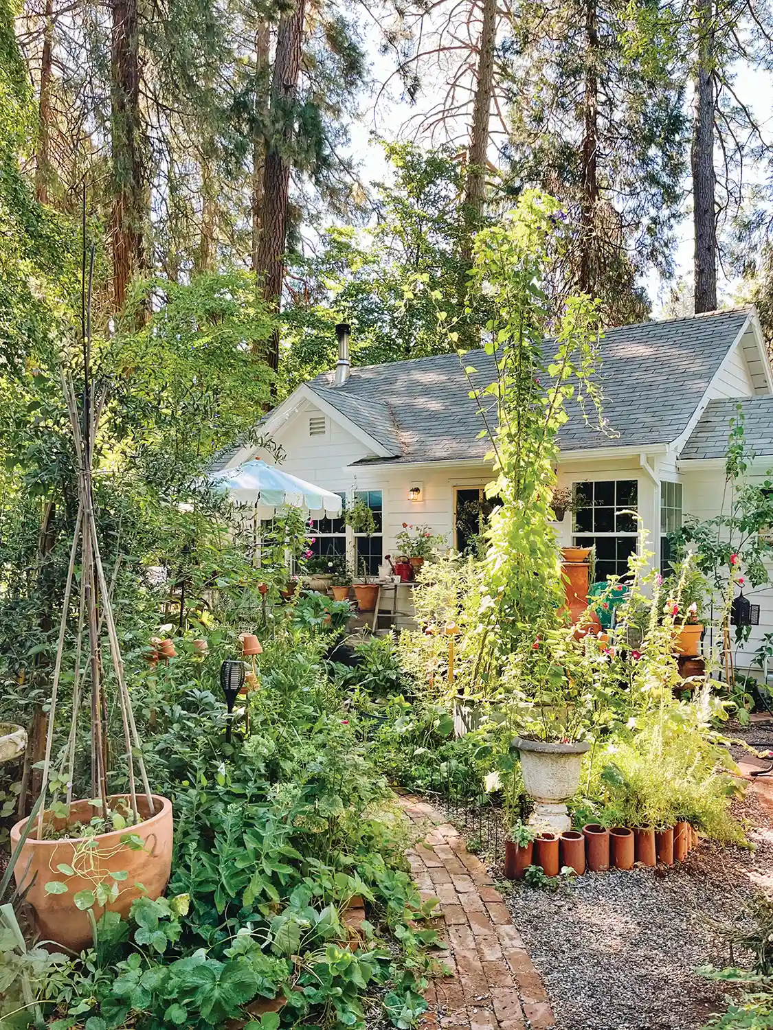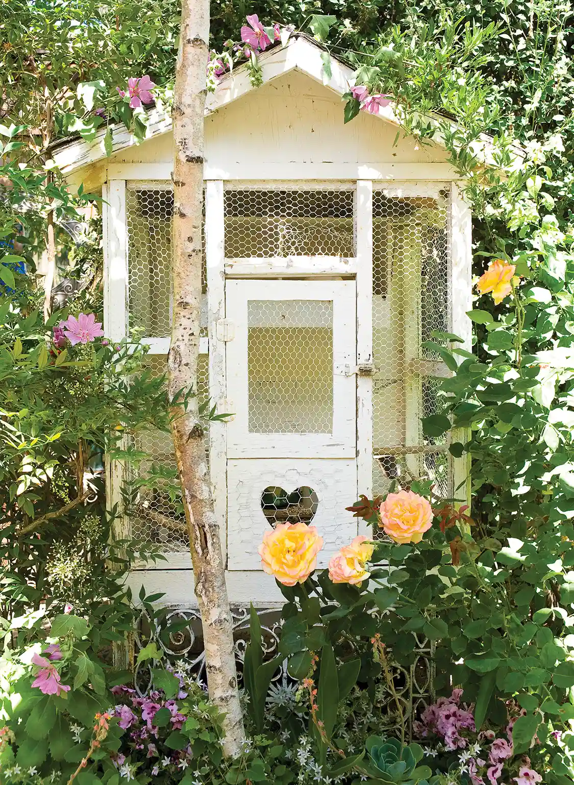 Located along the central coast of San Luis Obispo County in California, this wild, English garden thrives. We spoke to Sunday Hendrickson, the stylist of Catherine Deeter’s gorgeous garden. Situated 20 miles from the coast in a homespun town of about 7,000, called Templeton, Catherine tends to a space that has provides her respite while she navigated her son’s metabolic disorder. Catherine’s white shed seen here is a Dovecote, where two beautiful white doves live. Also on the property are tiny mosaic bird houses where many joyous birds reside. Sunday described the garden as “happy” and reflective of Catherine’s personality.