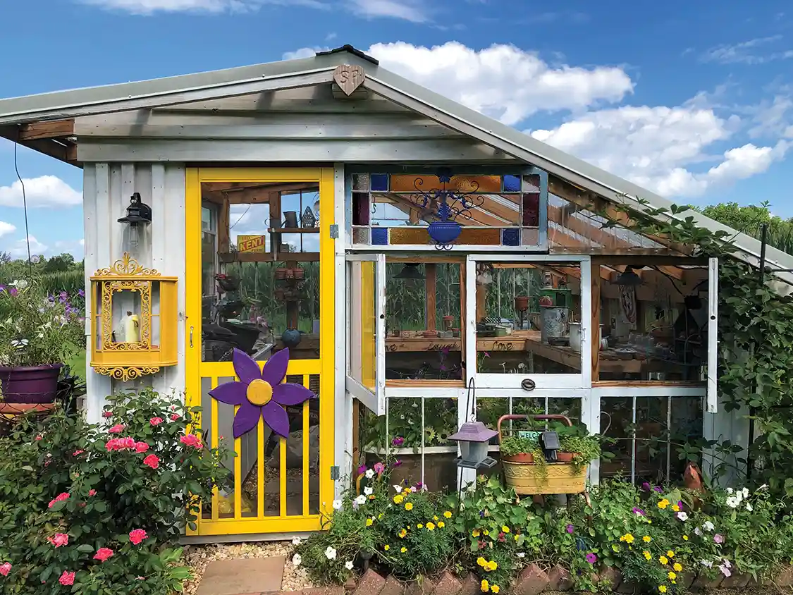 In southern Illinois, Navy veteran Shane Hileman and his wife Paula Hileman finished building their greenhouse in eight days! What’s even more amazing is that they used re-purposed materials; such as, stained-glass windows from their family’s home and doors from their parents’ old renovation projects. Paula further shared that the greenhouse benefits from lots of unique second-hand items that add charm and character. For example, Paula was given an old Montgomery Ward sink from her childhood church that she used as a potting bench. She added, “We were seeing an old bathtub in the front yard of a house we drove by all the time. One day, Shane said: ‘I’m stopping and asking is we can buy it for the greenhouse.’ He did, and now it sits in the front windows. Perfect for early lettuce patch and later filled with petunias planted from seed.” Shane also built shelving for seed trays and clay pots for all of Paula’s flea market gardening supplies. Paula also repurposes items like enamelware buckets, pans, teapots, and cups for pots; she says, “If it holds dirt I can plant in it,” and shares that the greenhouse is the perfect place to work on these projects.