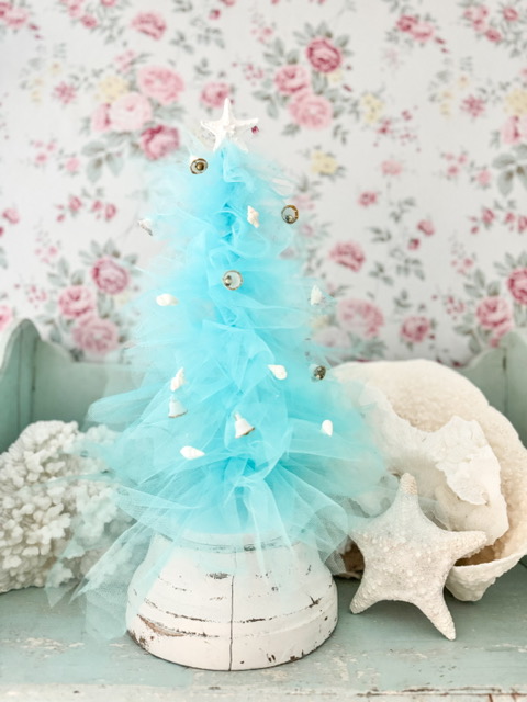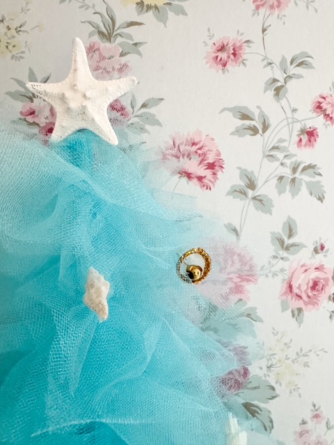 - Hot glue gun – Your trusty sidekick for keeping everything in place Decorative touches (optional but fun!) – Think vintage mini ornaments, dainty millinery flowers, sparkly garlands, or even a sprinkle of glitter — let your creativity run wild! I crafted a unique tree topper using a blend of natural and nostalgic elements—delicate seashells, vintage sugar bells, and a starfish as the crowning star.