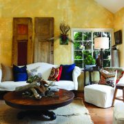 In this casual country living room, a glass-free window provides a focal point and a touch of personality on an otherwise plain wall. The lace behind the frame adds an interesting touch, while the vintage pediment above echoes the room’s colors.