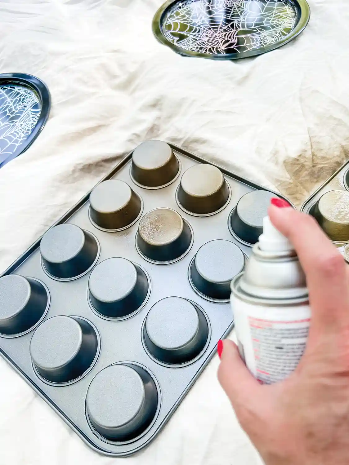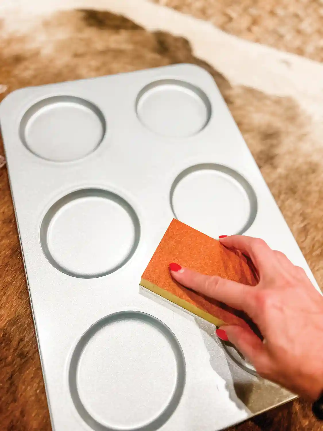If you are using a wood tray, you can paint it with acrylic paints in any color you choose. If you are using metal trays or muffin tins/whoopie pie tins, you must sand the metal before spray painting. I tried to skip this step once and the paint peeled in spots. If you use a newer muffin tin, it is likely coated with a non-stick finish, so a brisk once-over with the sanding block will help the paint stick. And don’t forget to do the insides of the tins, as well, and all around the openings and the edges of the tins.