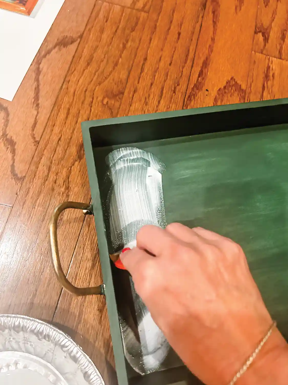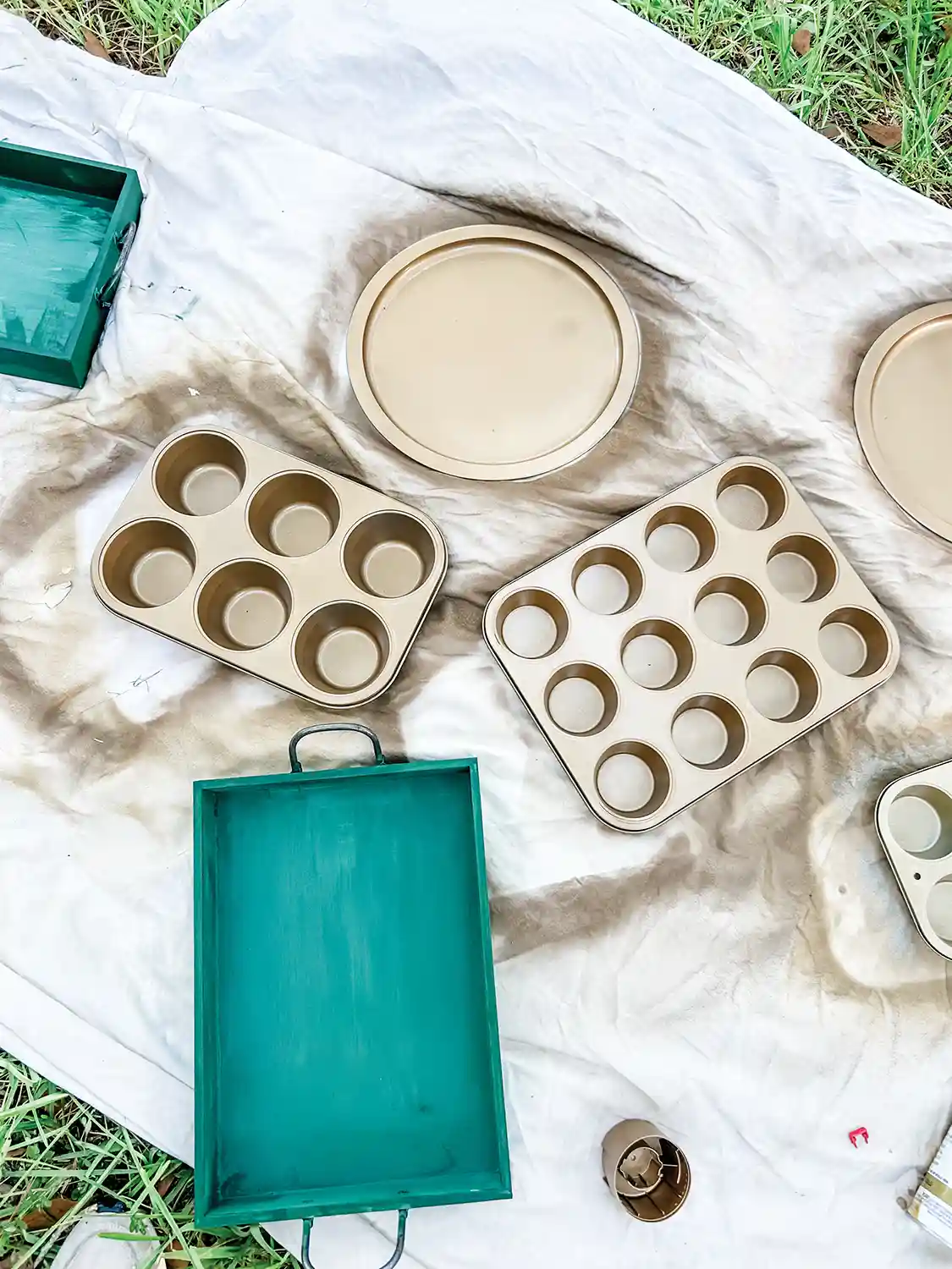 *Use spray paint for metal trays/tins and acrylic paint for wooden trays. I used Krylon Colormaxx Paint + Primer in Satin Hunter Green, Rust-Oleum Metallic Paint and Primer in One in Pure Gold and Metallic Champagne Bronze. The acrylic colors were DecoArt Hauser Dark Green, Glorious Gold, and Sage Mint.